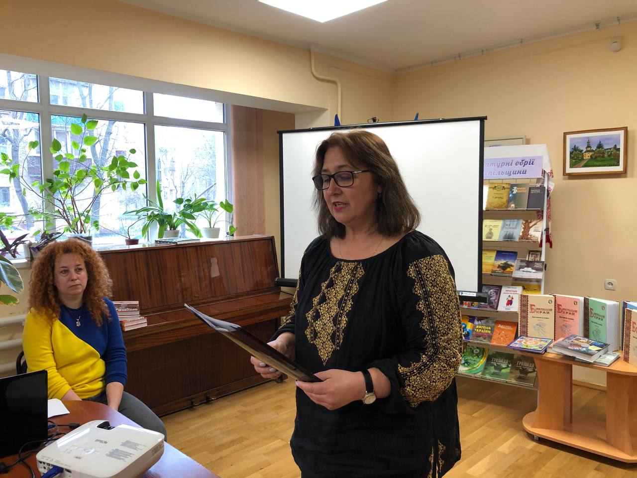 Ведуча заходу – директор бібліотеки Жанна Борисівна Кручиніна постаралась, щоб атмосфера зустрічі була цікавою, та зігріта родинним теплом.