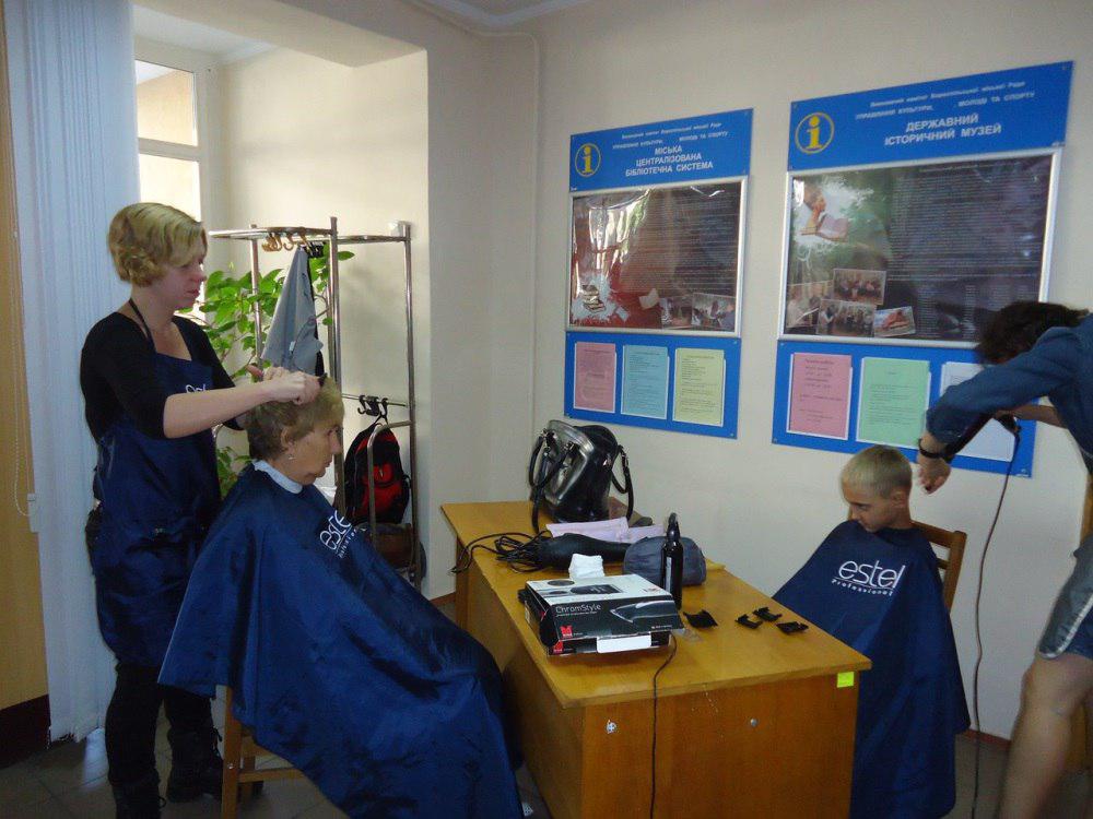 В бібліотеці повний аншлаг! Перукарські послуги почались майже з десятої замість 11.00. Ось декілька світлин з місця подій.