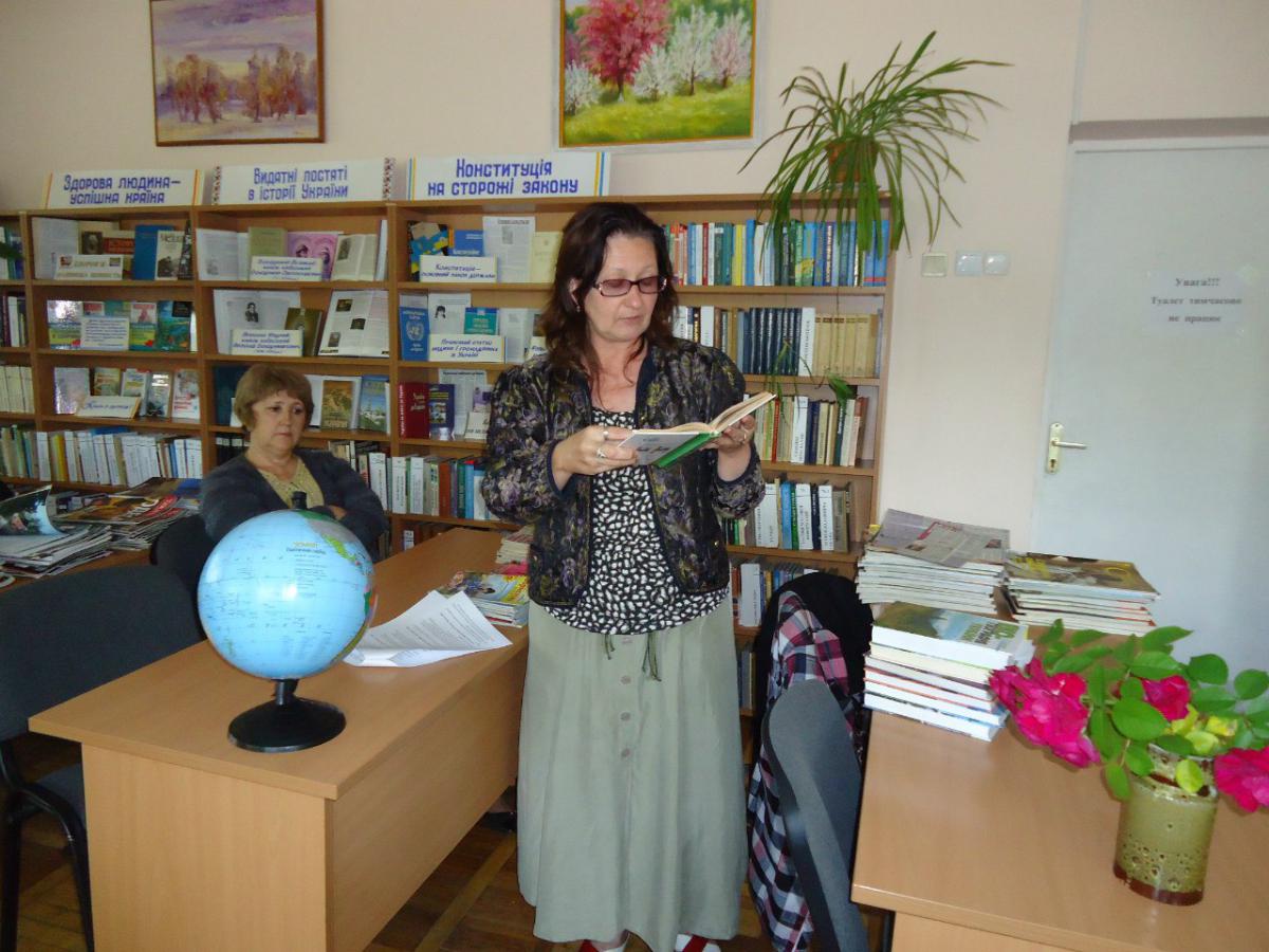 Методист Олена Костюкова виступила перед читачами з літературним екскурсом «Любіть і бережіть природу, вона віддячить нам здоров’ям і добром». Методист провела бібліографічний огляд, під час якого розповіла про книжки, що має читальний зал за такою тематикою. Також запросила читачів до абонементу переглянути книжки з книжково-ілюстративної виставки «Рідна природа». Олена Костюкова запропонувала читачам почитати книжки з екології та природознавства для отримання знань про тваринний і рослинний світ України.