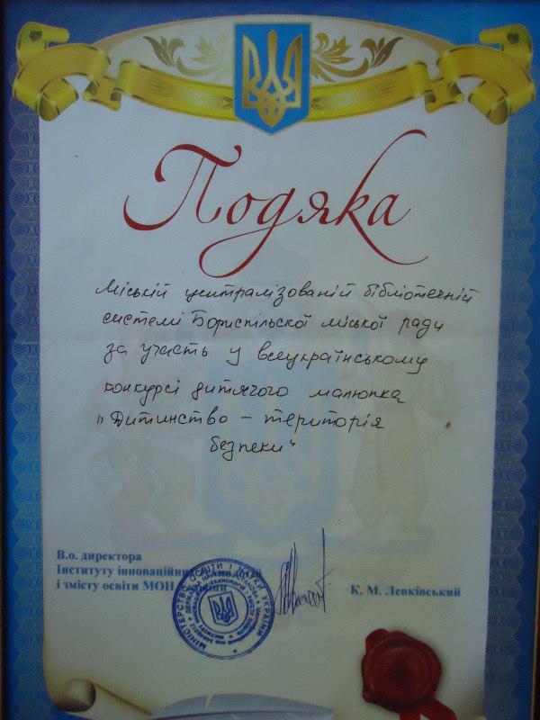 Від Бориспільської МЦБС участь у конкурсі взяла наша читачка Діана Урсан. Малюнок «Нелегальний перетин кордону» виконаний олівцем. Діана отримала Диплом учасника конкурсу, а Бориспільська міська центральна бібліотека – Подяку від Центру соціального лідерства.