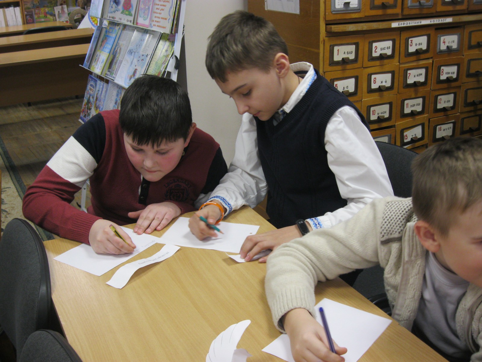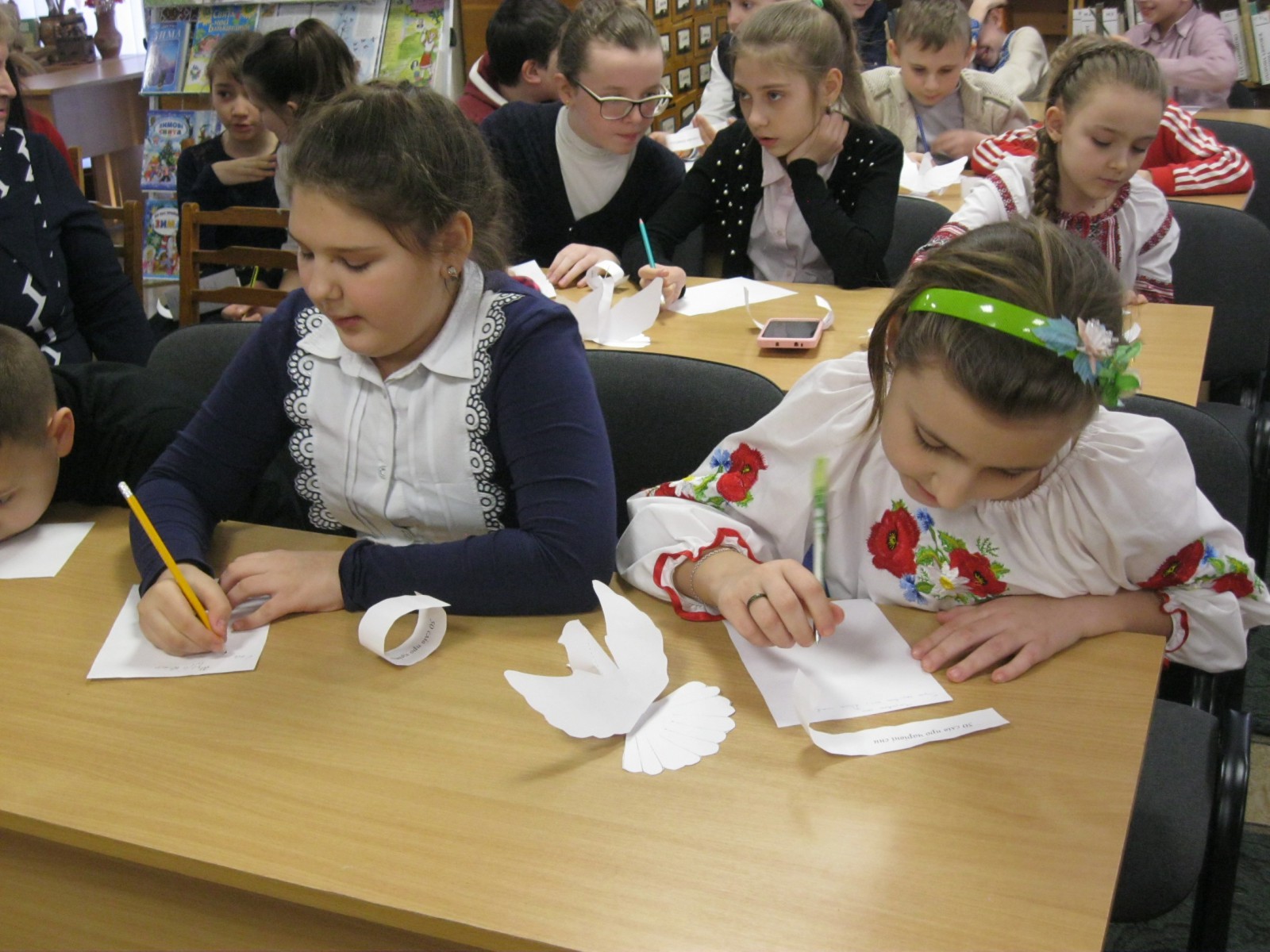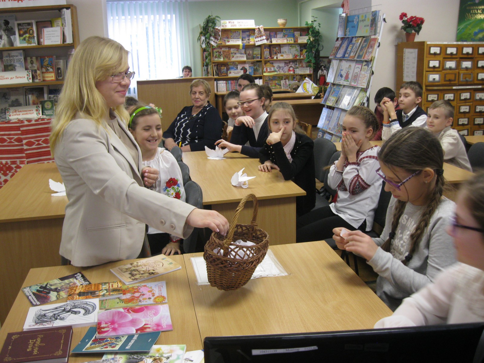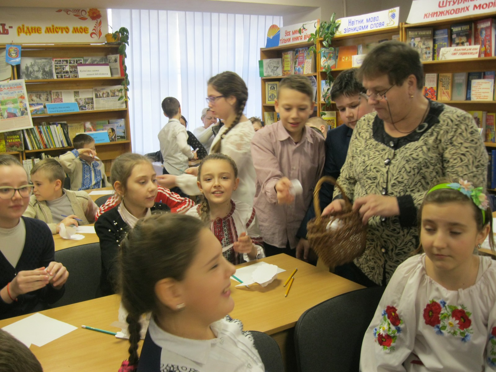 Діти теж підключилися до розмови; запитанням, здавалось, не буде кінця. За кращі запитання учні отримували символічну пташку. Згодом вони дістали творчі завдання: на вільну тему, яку вони самі обрали, потрібно було написати 50 слів. Діти приємно здивували всіх присутніх, коли вони не тільки придумали слова, а й з цих слів склали вірші, казки та оповідання. Кращі роботи були відмічені подарунками - їхні автори отримали від поетеси збірочку віршів.