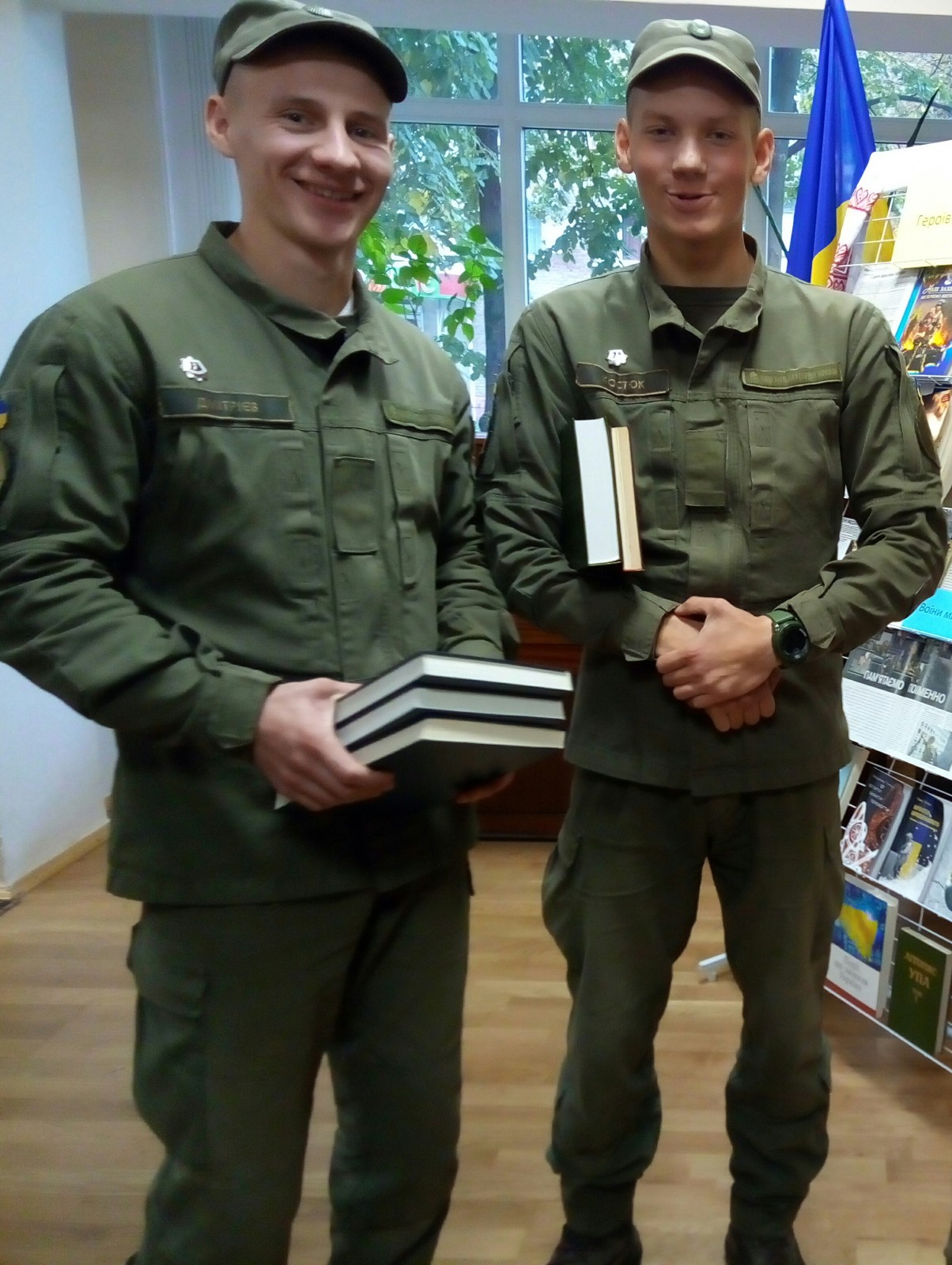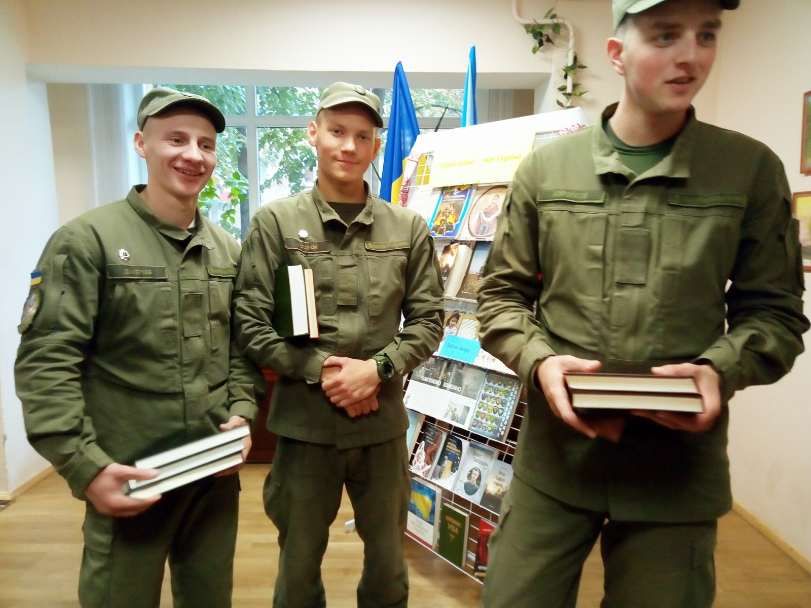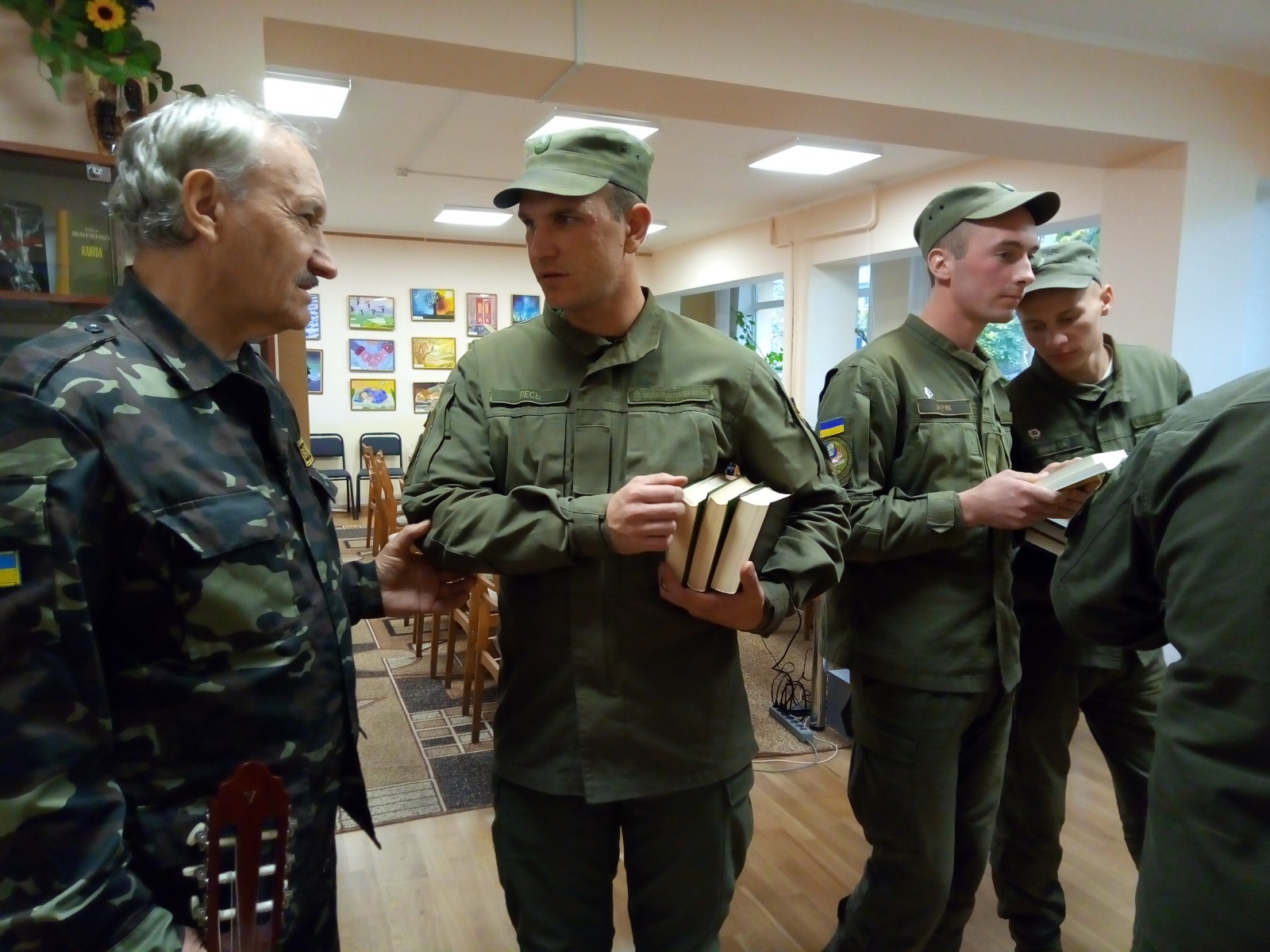 Наші гості, гвардійці, ознайомились з роботою бібліотеки, пройшли її залами і отримали подарунок - добірку книг з історії українського народу часів революції 1917 – 1921 років для бібліотеки підрозділу. І, звичайно ж, було зроблено фото на згадку про зустріч.