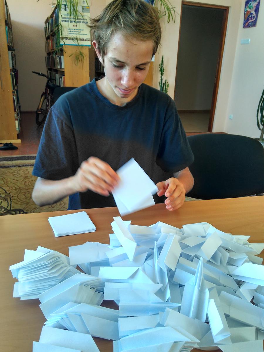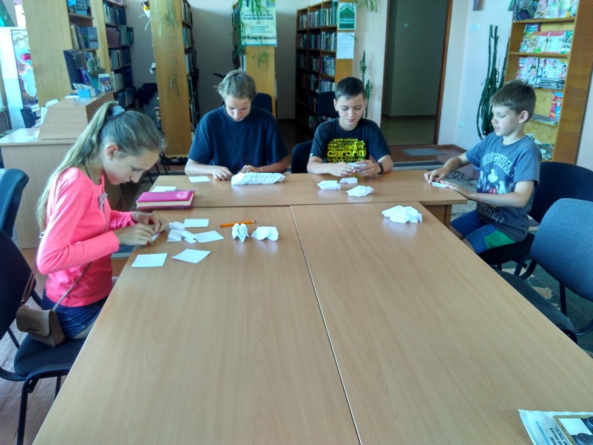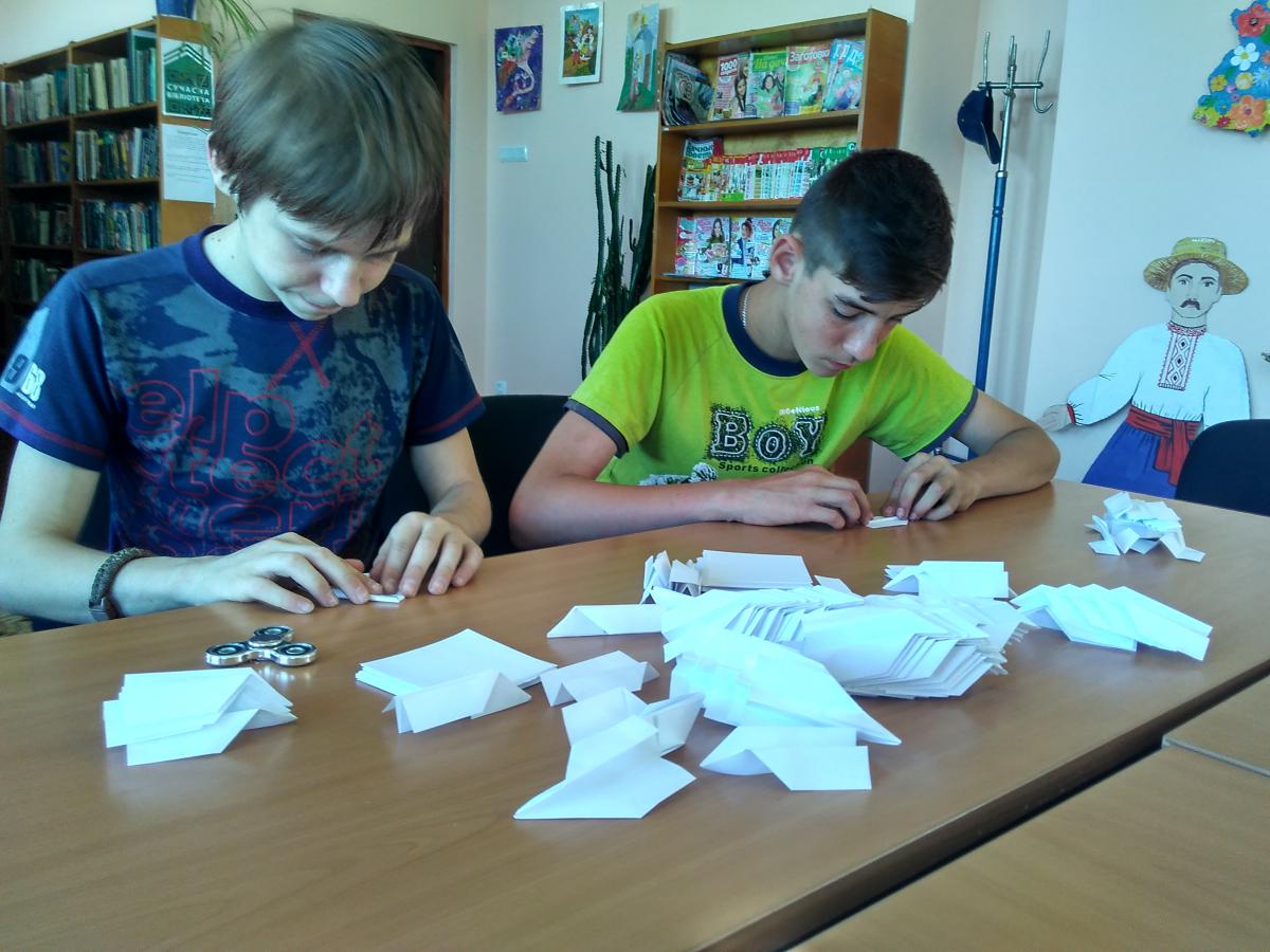 Діти-читачі бібліотеки-філії з ентузіазмом відгукнулися на пропозицію допомогти у підготовці проведення свята, присвяченого Дню молоді в нашому місті, яке відбудеться 25 червня. Їм було запропоновано виготовити паперові літачки для конкурсів. Це заняття захопило їх і навіть в процесі виготовлення виробів виникло змагання між дітьми: хто швидше і більше зробить літачків. Переміг Галишин Олег, за що і був нагороджений оплесками та цукерками. А щоб не так одноманітно проходив час, бібліотекар Ніна Бахмат ознайомила їх з творчістю поетів-земляків: читала вірші Олександра Колоса, Світлани Дідух-Романенко, Миколи Боровка.