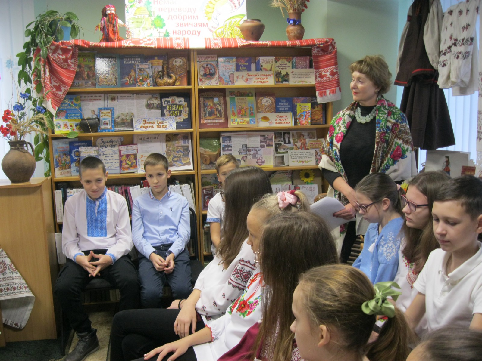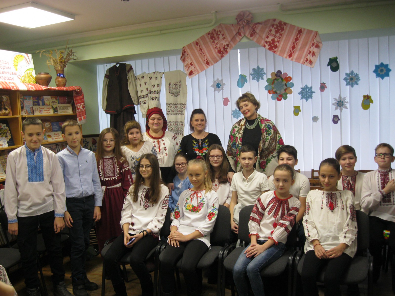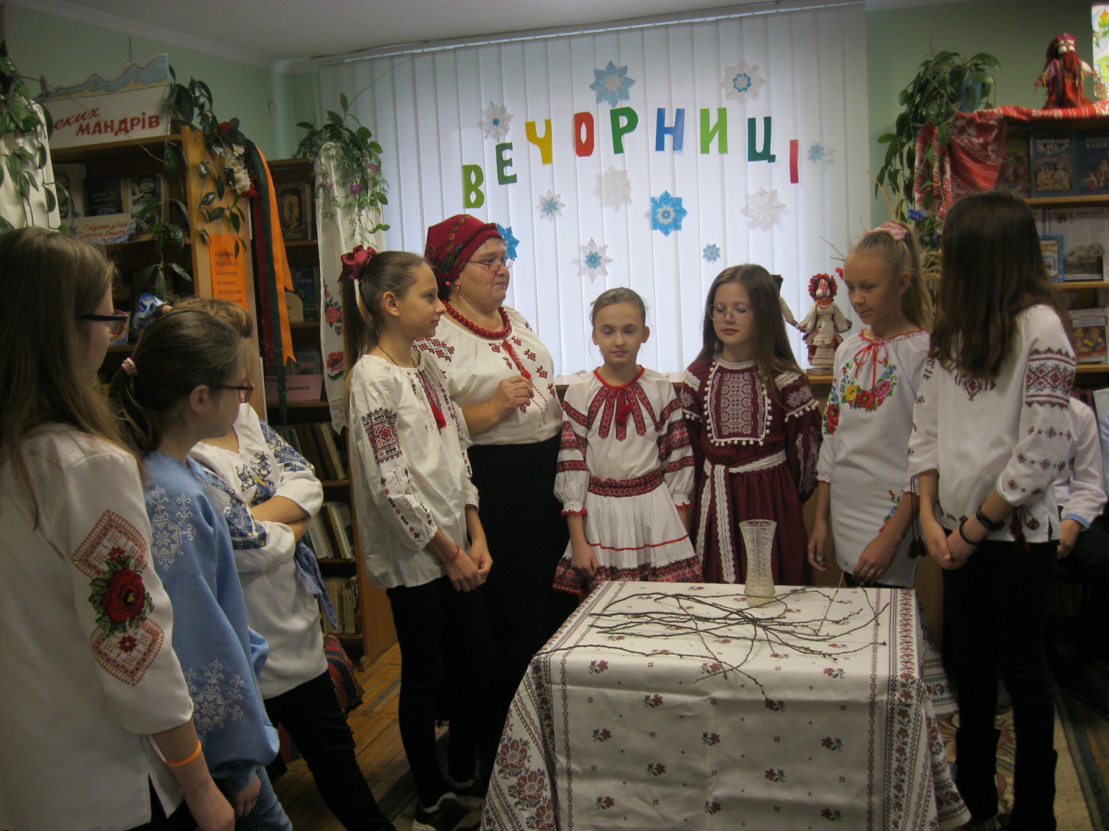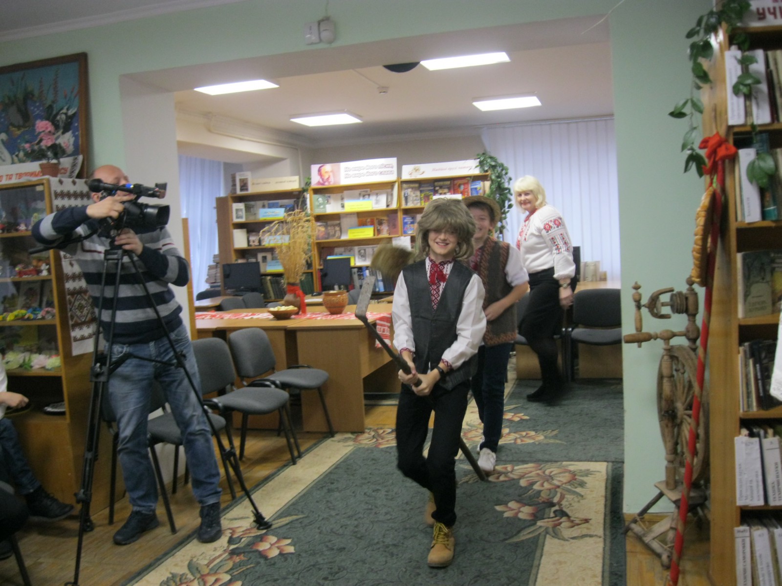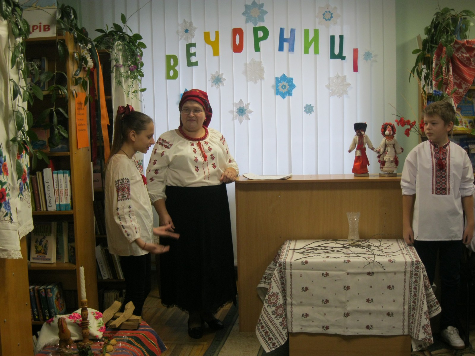 В залі бібліотеки був відтворений інтер’єр української світлиці, де господарювала господиня – бібліотекар Данчук Л.І., яка є керівником народознавчого клубу «Калинонька». Людмила Іванівна познайомила учасників із давніми народними звичаями проведення вечорниць, обрядами ворожіння та кусання Калити.