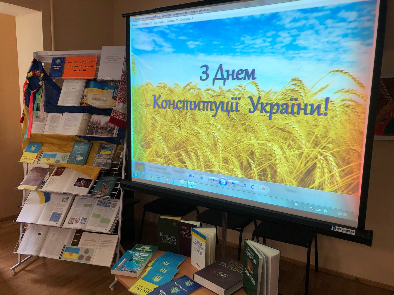 До заходу оформлено бібліотечну виставку «Конституція – Основний Закон держави» та онлайн презентація «Конституція – Паспорт Держави: сторінками Конституції України».