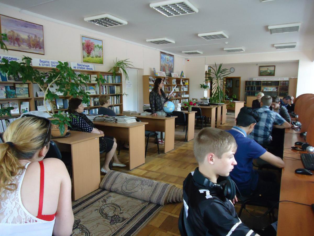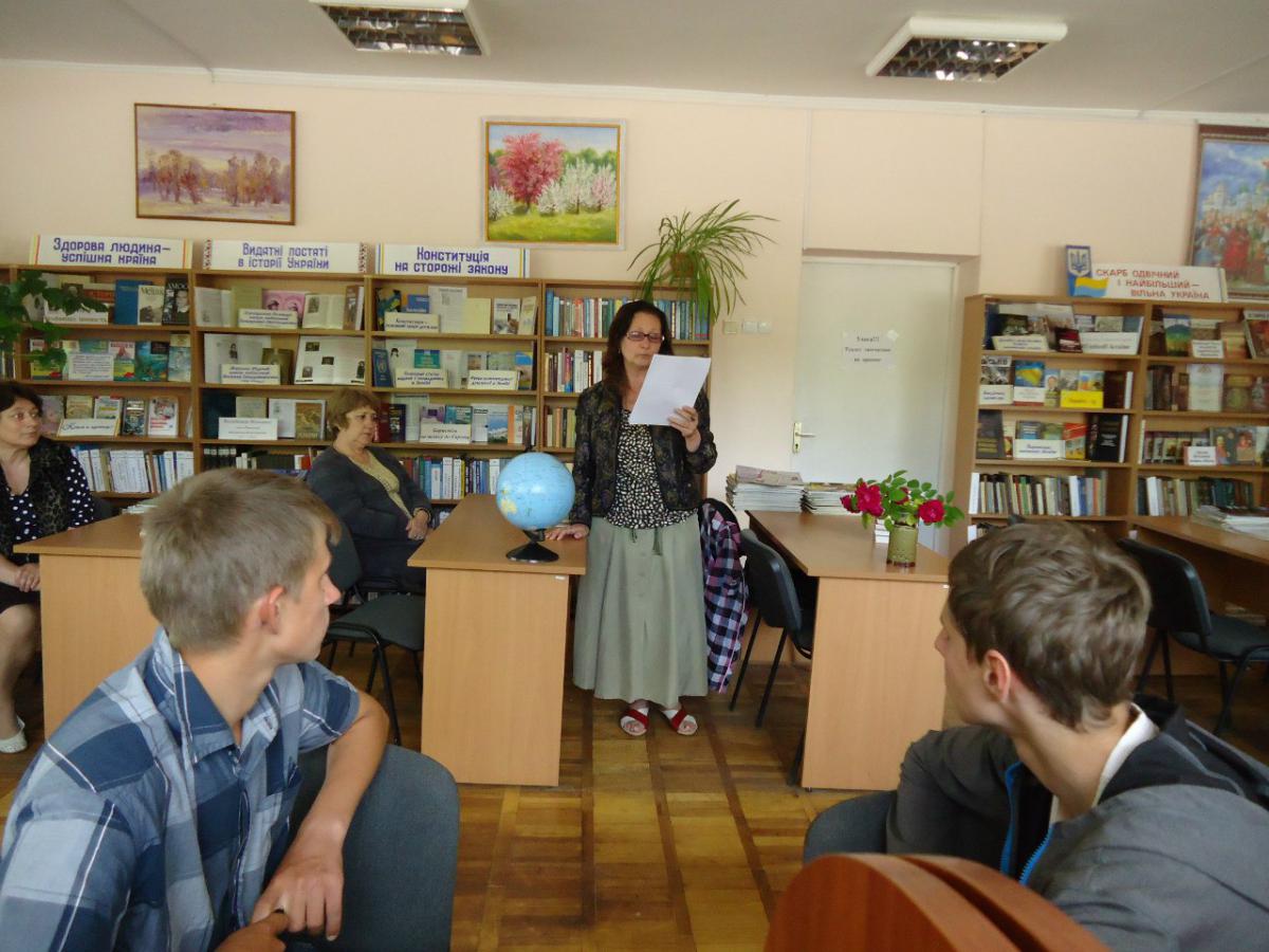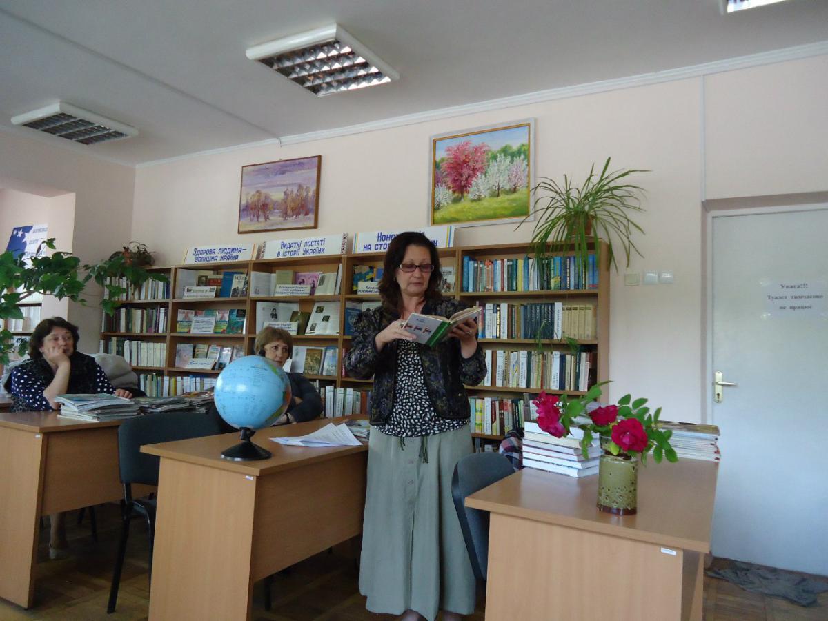 Методист Олена Костюкова виступила перед читачами з літературним екскурсом «Любіть і бережіть природу, вона віддячить нам здоров’ям і добром». Методист провела бібліографічний огляд, під час якого розповіла про книжки, що має читальний зал за такою тематикою. Також запросила читачів до абонементу переглянути книжки з книжково-ілюстративної виставки «Рідна природа». Олена Костюкова запропонувала читачам почитати книжки з екології та природознавства для отримання знань про тваринний і рослинний світ України. Директор бібліотеки Жанна Кручиніна закликала користувачів обережно ставитись до навколишньої природи, не смітити та не палити багаття в заборонених місцях. Читачі бібліотеки охоче підтримали цей заклик, тому що насправді ця тема нікого не лишає байдужим.