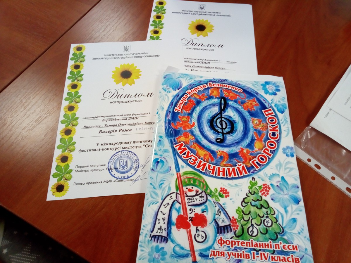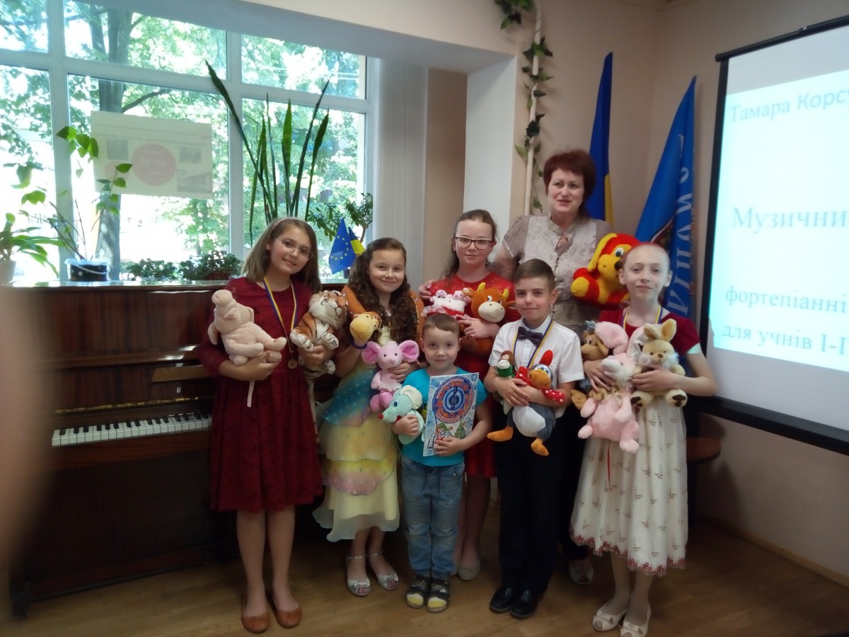 Викладач-методист Бориспільської ДМШ Корсун Тамара Олександрівна в імпровізованому концерті представила авторську збірку фортепіанних п’єc для початкової музичної школи «Музичний гороскоп». Збірка складається з дванадцяти оригінальних п’єс. Дитяча аудиторія була вражена фортепіанними мініатюрами, які подавались з авторськими віршами, деякі з піснями та чудовими кольоровими малюнками зі збірки, продемонстрованими у вигляді слайдів. Автор малюнків-розфарбовок тварин у національному стилі петриківського розпису – талановита бориспільська художниця, педагог, керівник гуртка «Петриківський розпис» Центру технічної творчості «Евріка» Наталія Василівна Лой. Збірка видана за сприяння Бориспільської міської ради та підтримки Бориспільської ДМШ. Одним з рецезентів є Микола Боровко, наш земляк, заслужений працівник освіти України, лауреат премій ім. Андрія Малишка та ім. Павла Чубинського.