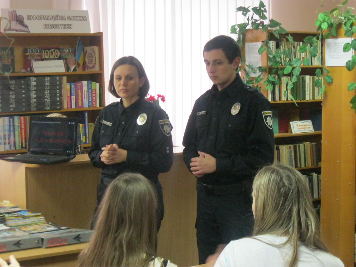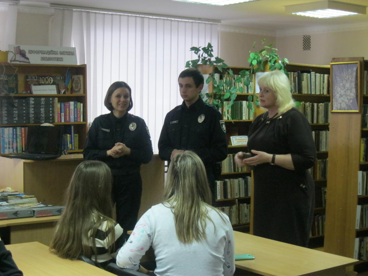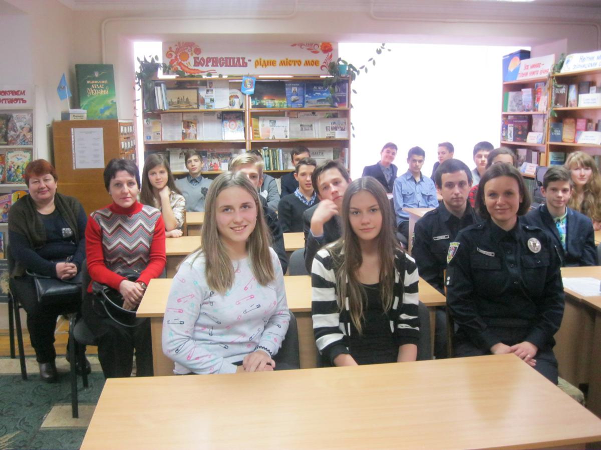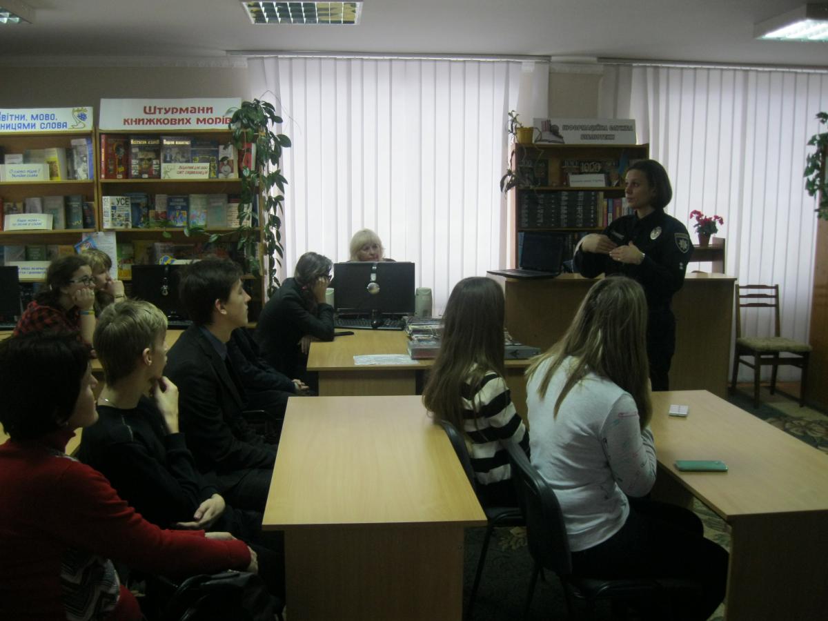 В рамках Всеукраїнського тижня права 6 грудня 2016 в дитячій міській бібліотеці відбулася зустріч-діалог «Навчись поважати закони держави» з інспекторами патрульної служби лейтенантами Іриною Горобченко та Ігорем Горєлим. На зустріч були запрошені читачі-учні 9-Б класу ЗОШ № 6 (кл. керівник Середа Н.В.).