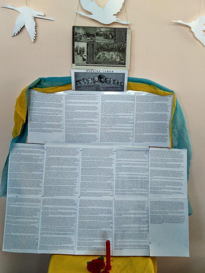 Пам’яті Героїв Небесної сотні, учасників Революції гідності присвячена виставка-пам"ять "Небесна сотня.Герої не вмирають..." в бібліотеці-філії м.Борисполя, біля якої бібліотекар провела бесіди про героїчні подвиги звичайних людей, які віддали свої життя на Майдані за свободу України, за прагнення мати власний шлях розвитку, звісно, не відокремлений від усього світу, але й не нав’язаний ззовні, який ґрунтувався б на загальнолюдських цінностях