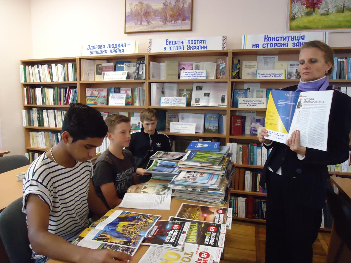 14 вересня 2017 в читальній залі центральної бібліотеки бібліотекар Людмила Базікалова провела для юнацької аудиторії огляд випусків журналу «Новое Время». Вона звернула увагу читачів на матеріали видань, присвячених маловідомим історіям з життя відомих політиків. Розповіла чому чоловіки повинні вчитись у генерала Шарля де Голля. Людмила Вікторівна наголосила на матеріалах, присвячених українським політикам.