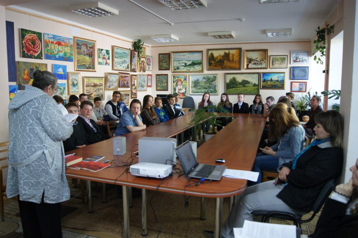 Гість заходу письменниця, громадський діяч Світлана Олексіївна Тимченко поділилася дитячими спогадами про війну, провела зв'зок із сьгоднішньою, неоголошеною війною на сході та півдні України. Учні прослухали новелу "Перейдіть мені дорогу на щастя, мамо" в авторському виконанні письменниці. В рамках заходу відбувся перегляд відео «Щоб пам’ятали», відеоролік пісні "Перемога". На закінчення зустрічі учні сфотографувались біля картини "УКРАЇНА СЛАВЕТНА",про яку їм розповіла директор бібліотеки Жанна Кручиніна.