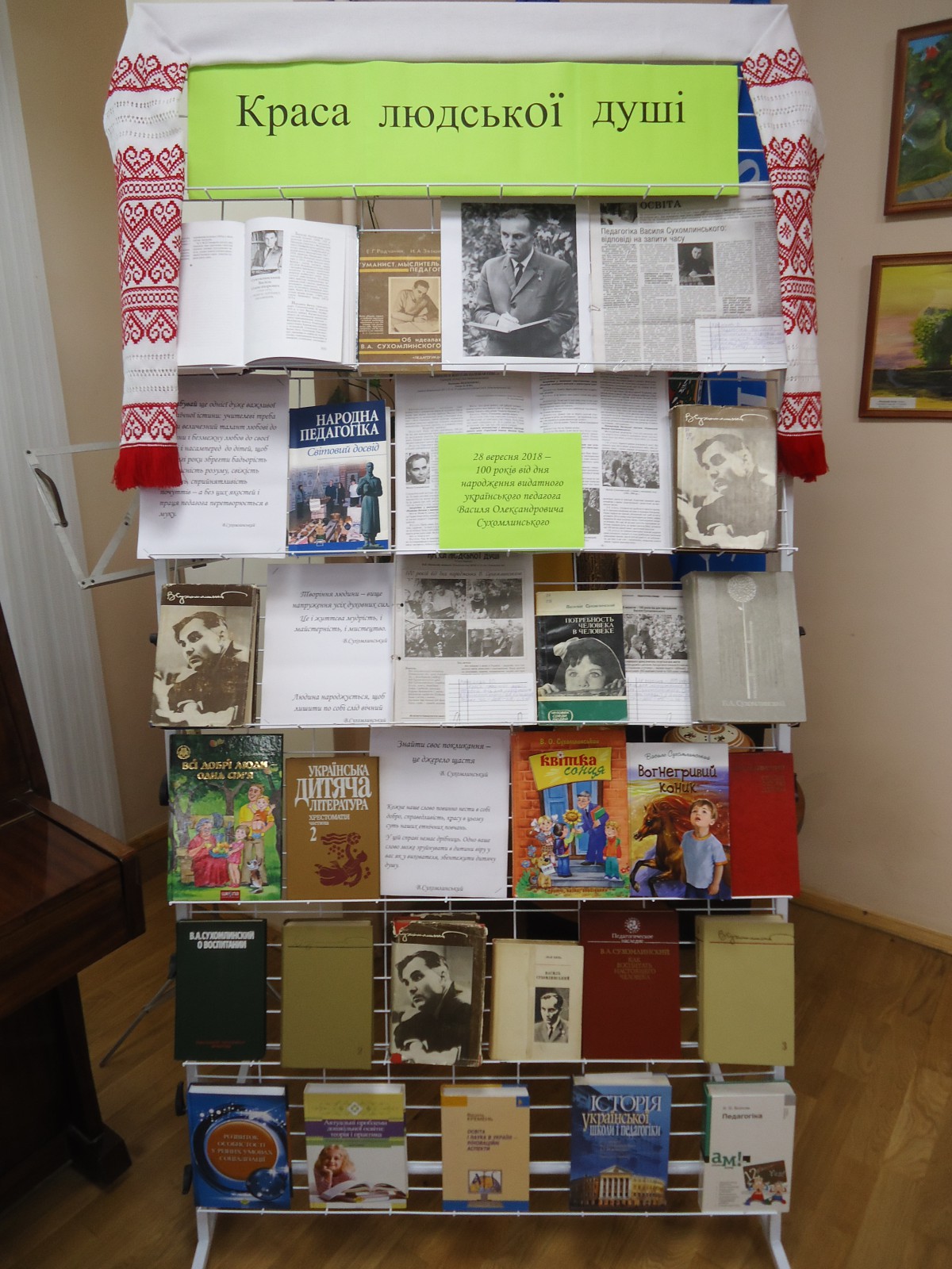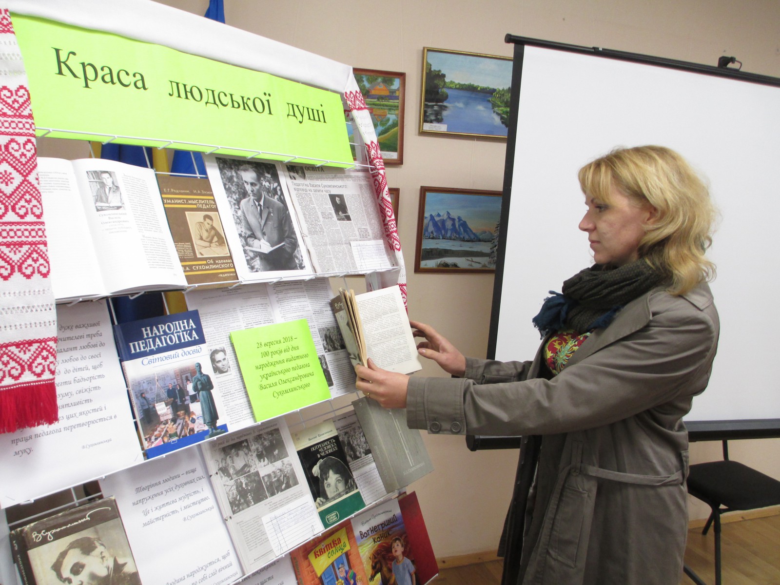 26 вересня 2018 в бориспільській центральній бібілотеці відбулись Педагогічні читання «Скарбниця педагогічних ідей Василя Сухомлинського». Читання приурочені до100-річчя від дня народження В.О. Сухомлинського. В привітальному сові завідуюча відділом обслуговування центральної бібліотеки Ірина Опалій звернула увагу учасників заходу на книжкову виставку «Краса людської душі», присвячену великому українському педагогу Василю Сухомлинському.