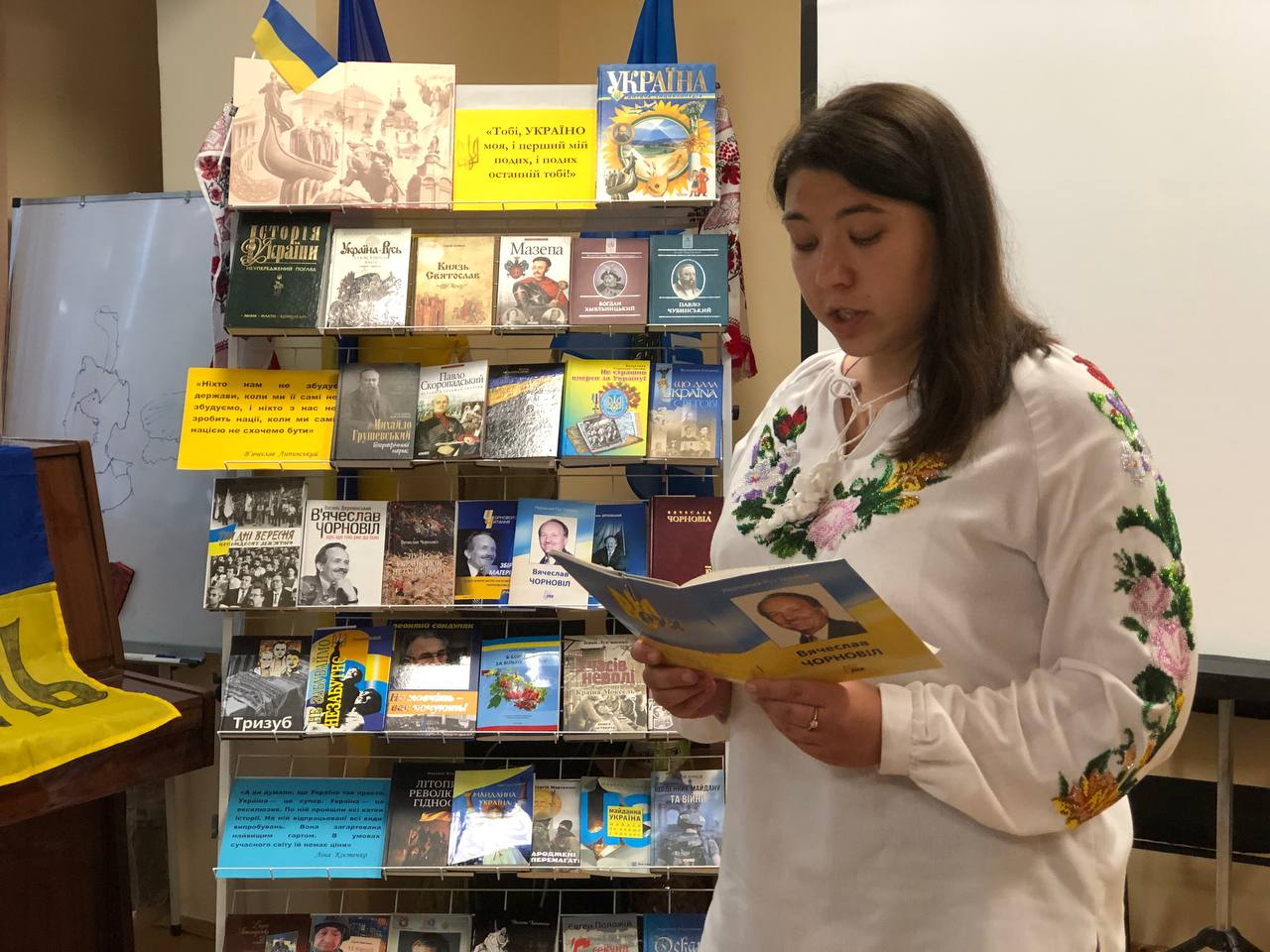 Бібліотекарі представили книжкову виставку «Тобі, Україно моя, і перший мій подих, і подих останній тобі» присвячену багатовіковій боротьбі українського народу за волю. Були зачитані уривки і досі актуальних висловів Вʼячеслава Чорновола з його 10-томника Творів, який є у наявності в бібліотеці.