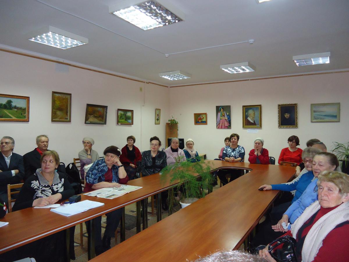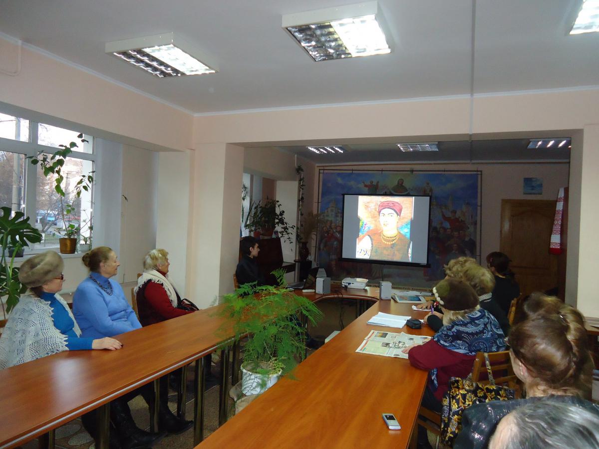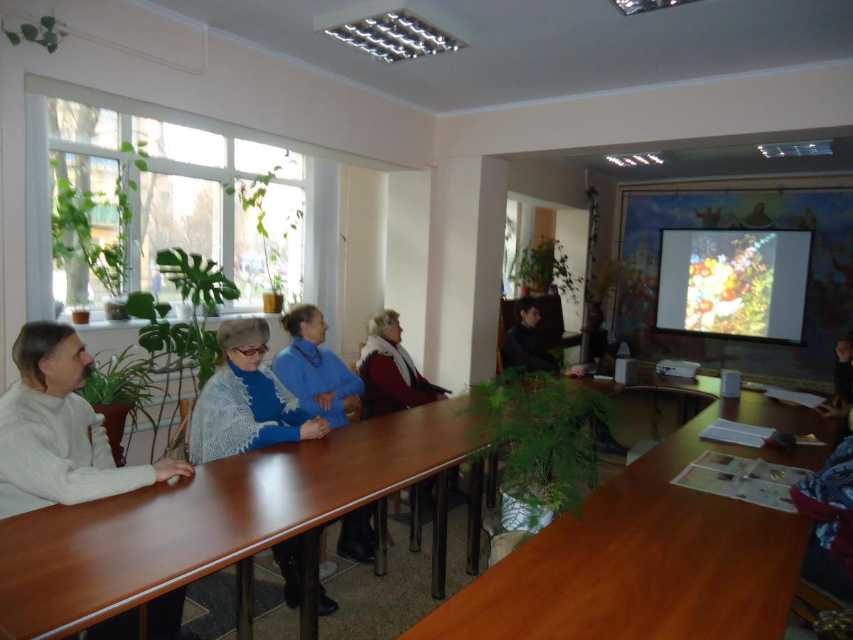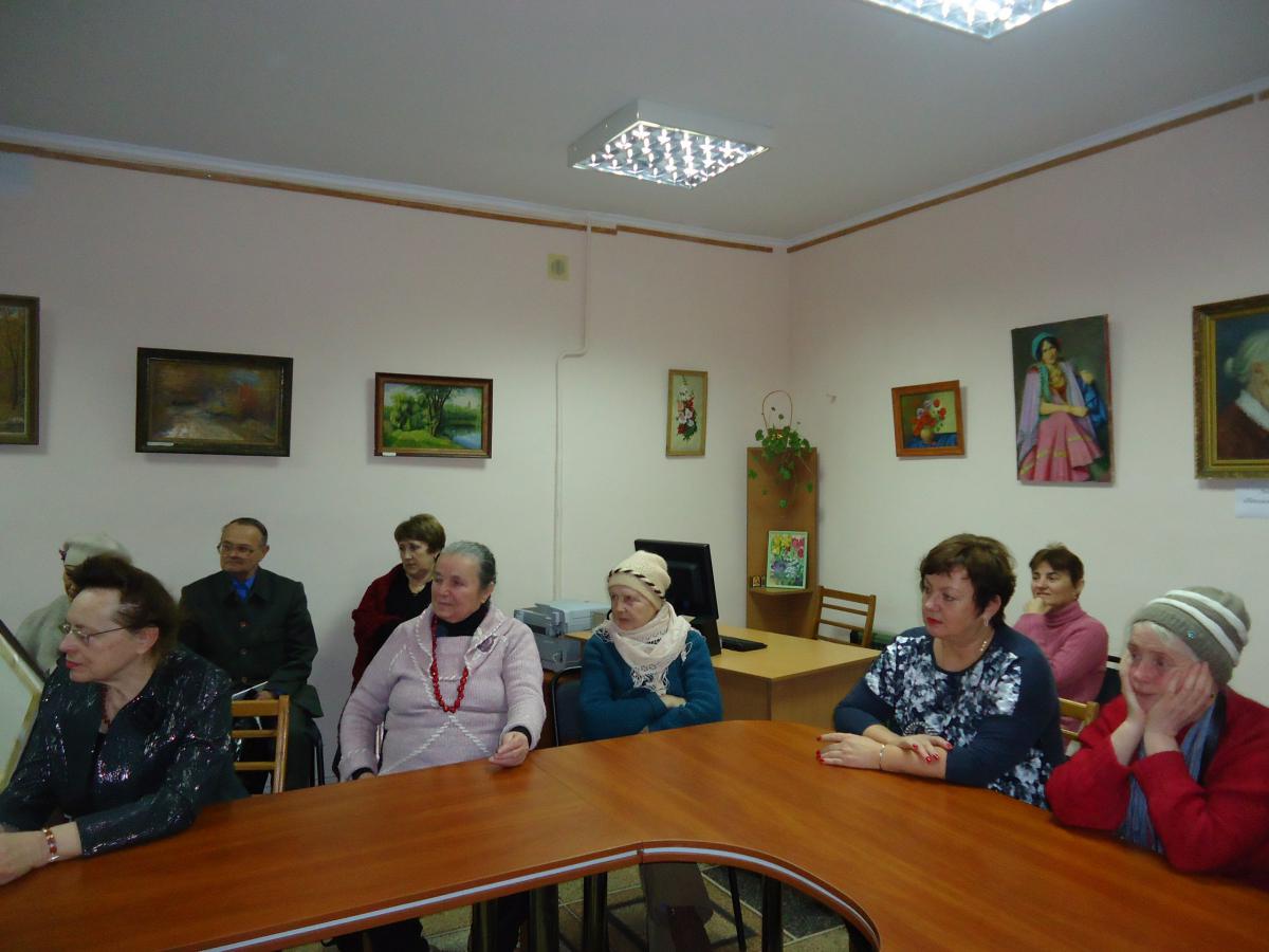 Розповідь про художницю ілюструвалась переглядом відео та уривків кінофільмів, присвячених Катерині Білокур. Своєю неповторністю і щирістю милували присутніх картини, показані на широкому екрані за допомогою проектора. Згодом захід змінив формат – почався цікавий обмін враженнями відвідувань мистецької виставки живопису Катерини Білокур в Мистецькому Арсеналі, картинної галереї в Яготині, музею-садиби художниці в селі Богданівка. На згадку про вечір було зроблене фото.