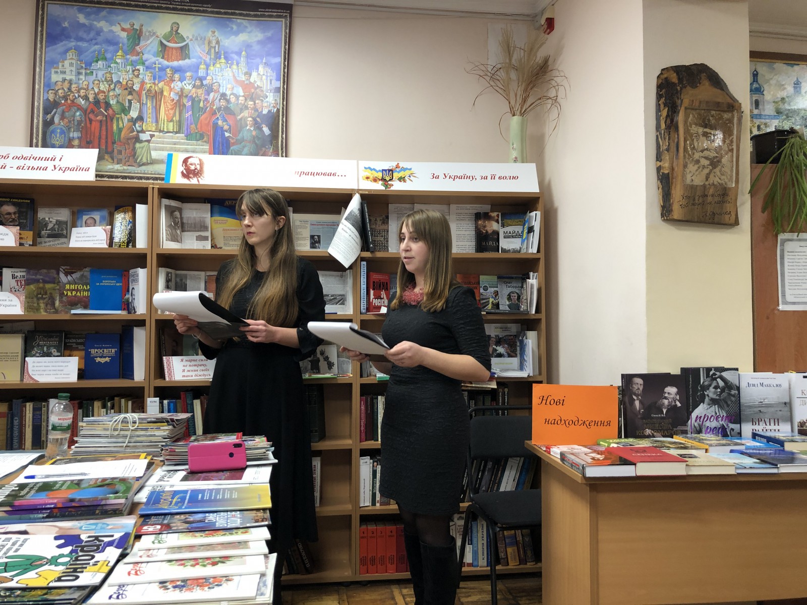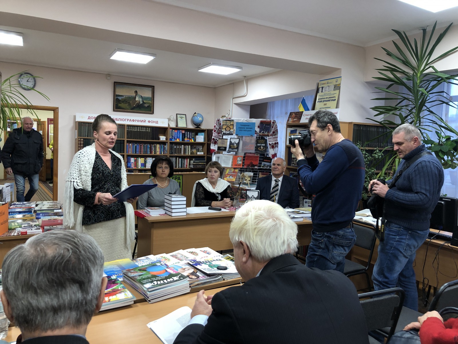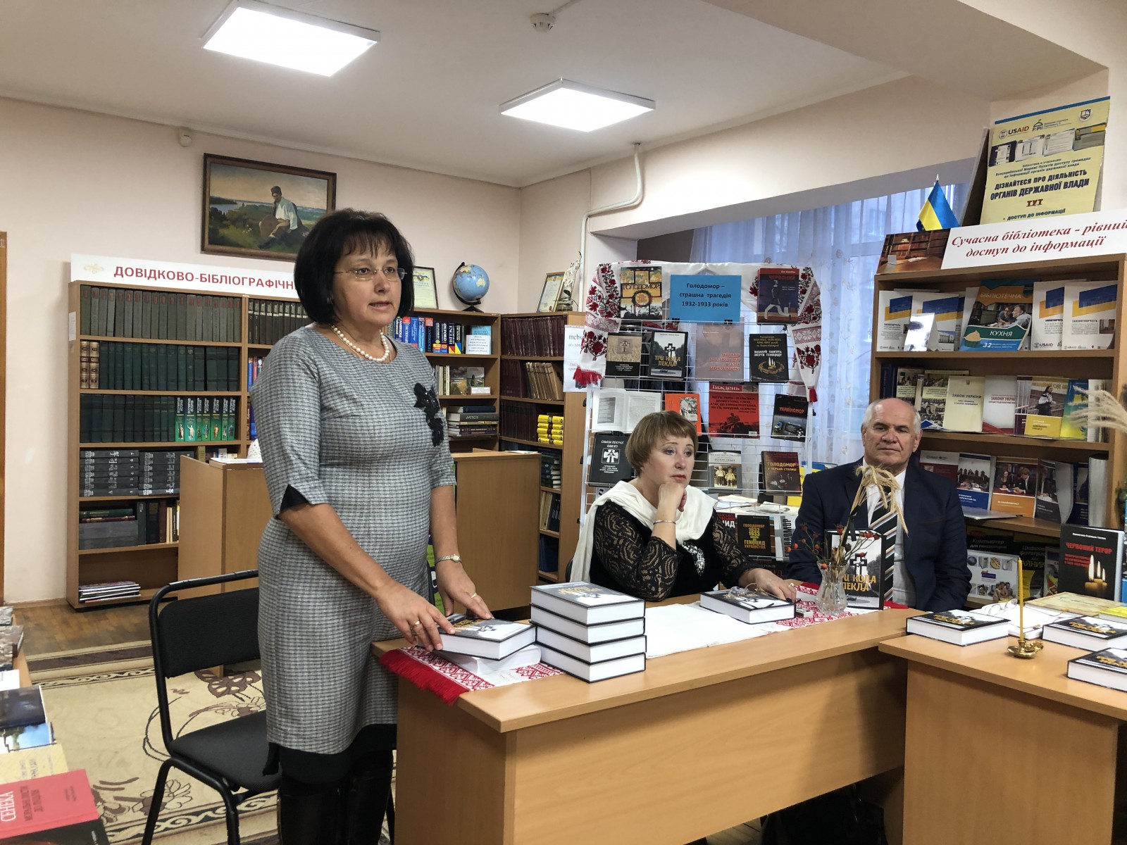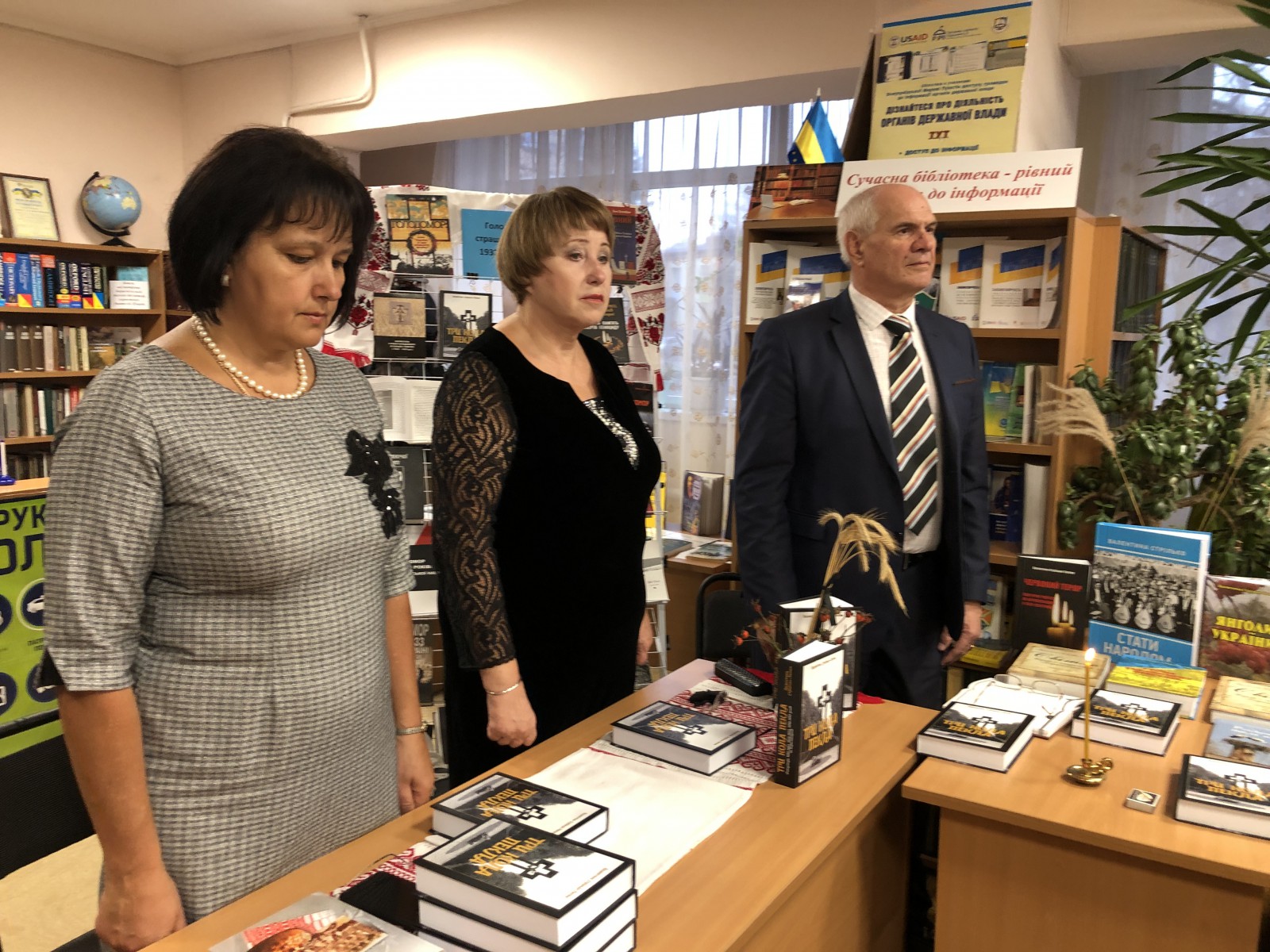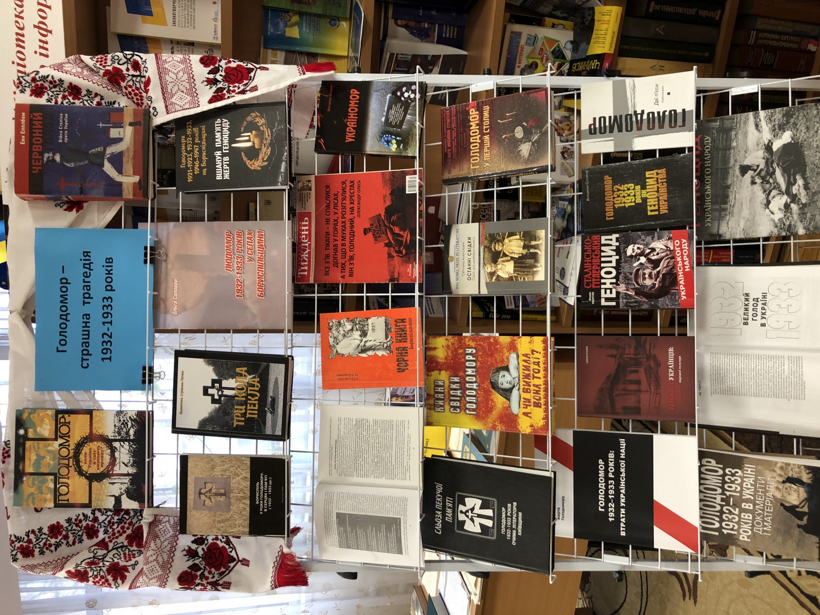 До заходу в бібіліотеці представлена книжково-ілюстративна виставка про Голодомор в Україні «Свіча пам’яті» та виставка книг Валентини Стрілько «Янголи України», «Червоний терор» та книга "Стати народом" про роботу Гнідинської школи. . Важко не погодитись зі словами Валентини Василівни про важливість пам"ятати цієї важкої теми та передачі її наступним поколінням і утвердження саме терміну "Геноцид". Адже, якби не ці зламні події нас, українців, можливо було б 100 млн.