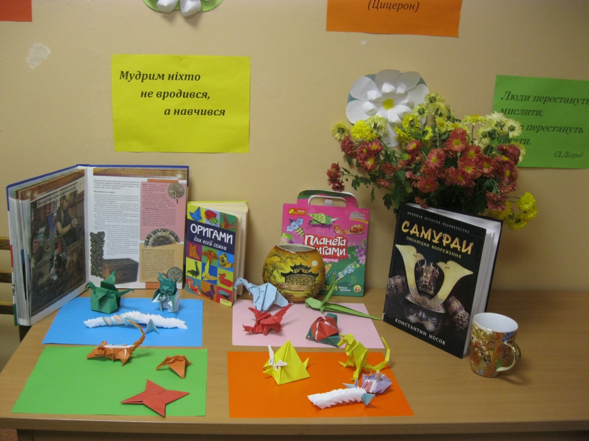 У фойє бібліотеки дітей зустрічала яскрава книжкова виставка «Загадкова Японія», на якій представлені матеріали про історію, економіку країни. Знайомство з експозицією доповнило відомі дітям факти різними цікавинками з національного японського фольклору, зацікавило самобутньою японською культурою. Тут же, поряд з виставкою були представлені роботи читача бібліотеки, учня 6-Б класу гімназії «Перспектива» Максима Назімова, виконані в стилі оригамі.