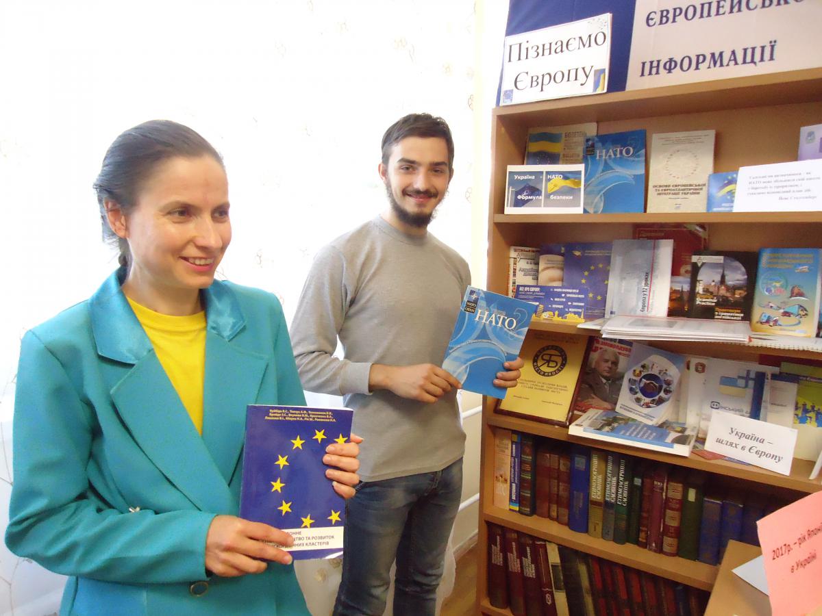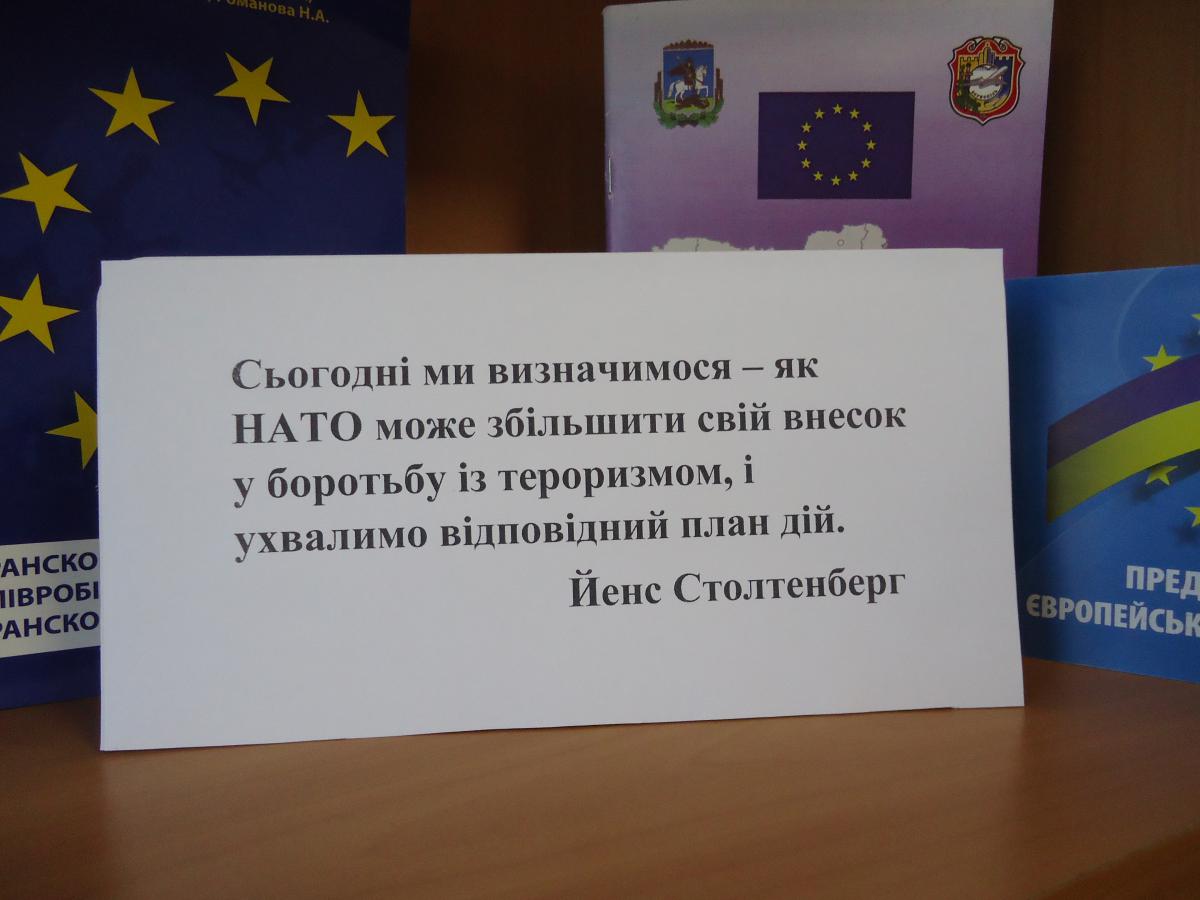 Працівники бібліотеки, відповідальні за роботу ПЄІ зосередили увагу відвідувачів на змісті Указу Президента України від 21 лютого 2017 та промови Президента України від 7 вересня 2017 в Верховній Раді на поличках з виданнями, присвяченими північно-атлантичному союзу. Інформація поличок з теми наголошує на тому, що не менш важливим, ніж членство в Євросоюзі, є для нас і участь в НАТО.