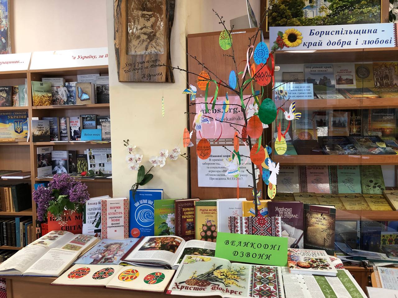 У читальній залі Бориспільської Публічної бібліотеки імені Вʼячеслава Чорновола розгорнуто книжково-ілюстративну виставку «Великоді дзвони». Тут представлені видання про народні традиції відзначення Великодня. Значна частина виставки присвячена писанкарству. В народі кажуть: доки люди будуть писанки писати, доти буде наш край процвітати. Переглянувши представлену літературу можна дізнатися про витоки традиції писанкарства, про значення символів, які наносять на писанки та крашанки. Що потрібно покласти у великодній кошик, смачні рецепти пасок, великоднього печива та красиві великодні декорації для своєї оселі – все це можна дізнатися, відвідавши переглянувши запропоновані на виставці видання.