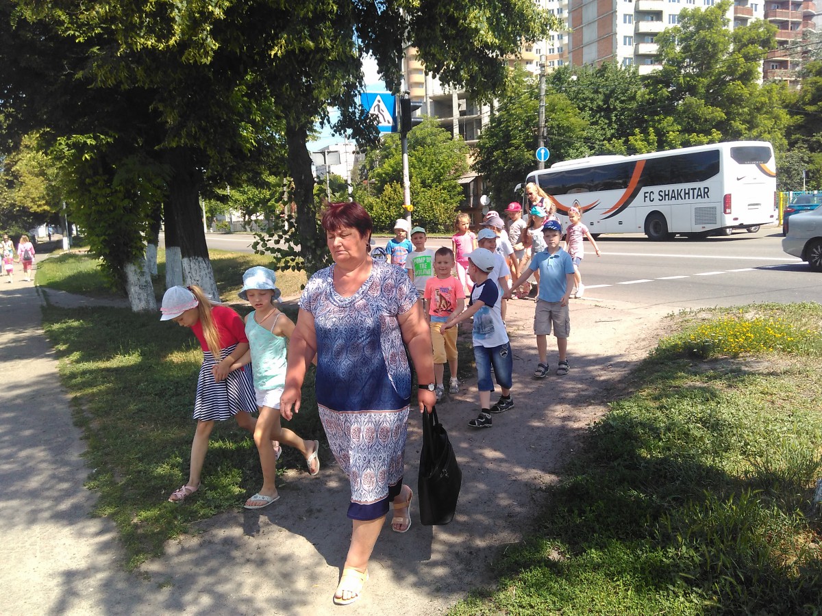 На запрошення бібліотекаря дітей одного із загонів табору ЗОШ №3 до центру туризму супроводжували патрульні поліцейські. Вже в школі вони провели навчання з правил дорожнього руху.