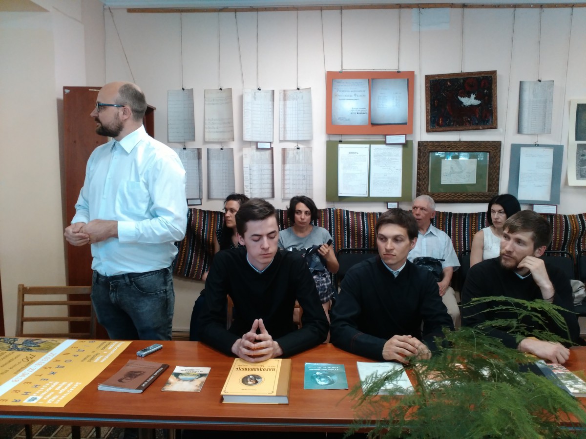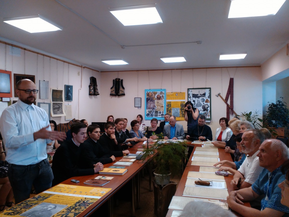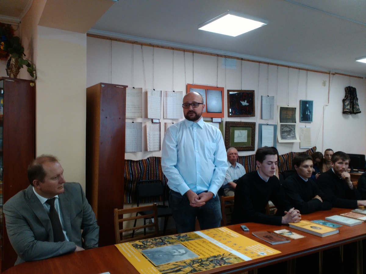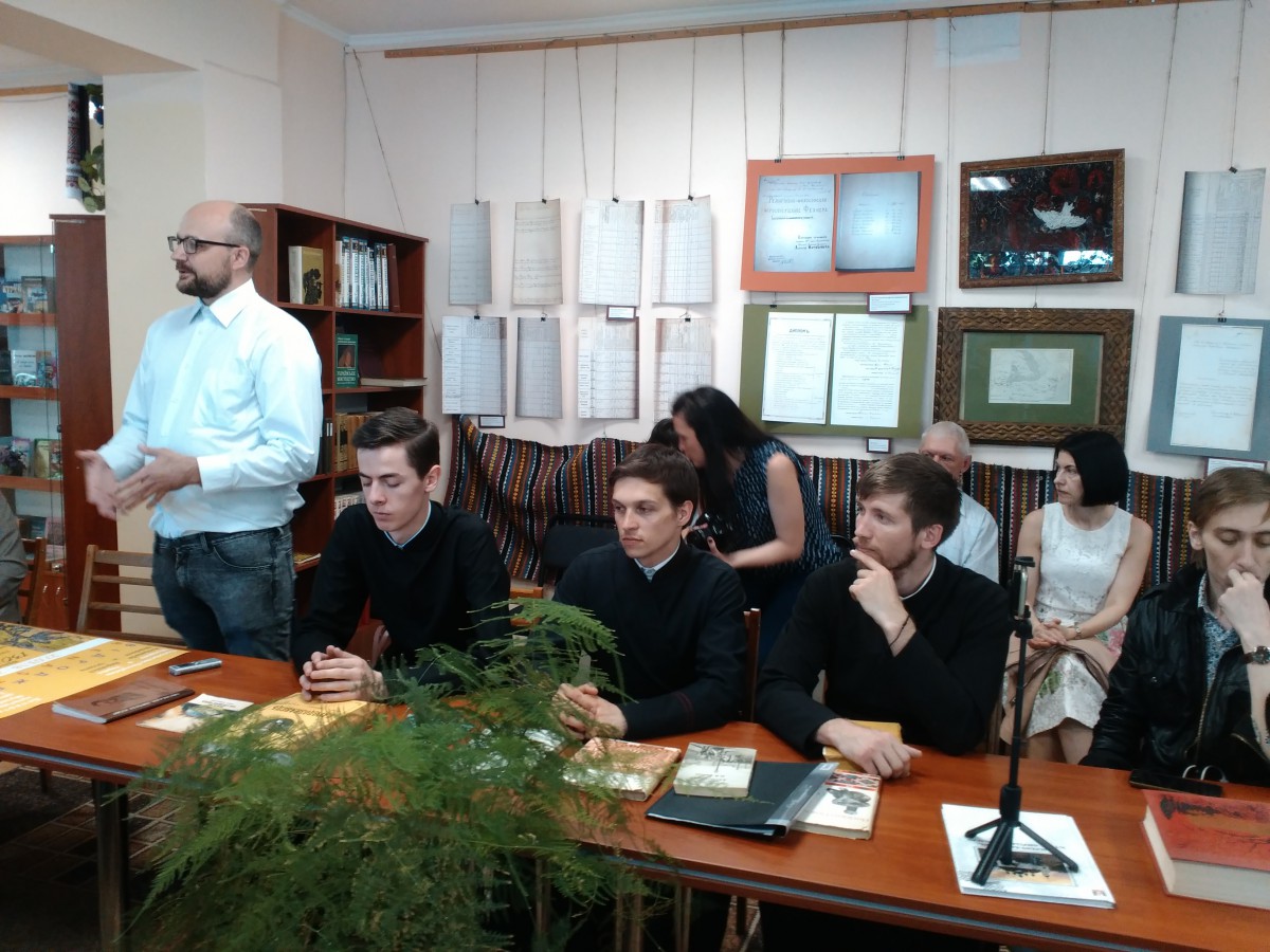 Ім’я Олексія Матеєвича стоїть поруч з ім’ям автора Національного Гімну України, нашого земляка Павла Чубинського. У них насправді багато спільного, жили в один і той же час, були етнографами, фольклористами, надзвичайно ерудованими, попри недовге життя встигли багато зробити, а вдячні нащадки увіковічили їхні імена. Саме про це, підкріплюючи розповідь цікавими фактами, доповів ініціатор виставки - історик, старший науковий працівник музею Книги і Друкарства України, письменник, читач бібліотеки Сергій Дячук.
