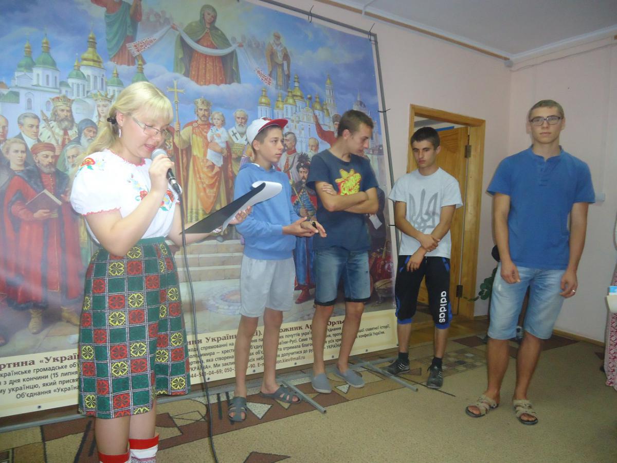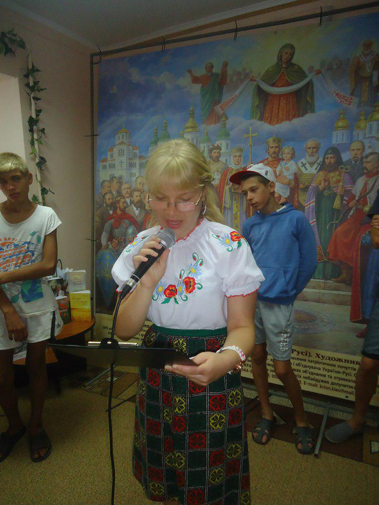 Художниця, поетеса Катерина Поляруш - презентувала тарілки виконані нею в техніці вітражного розпису. З її розповіді всі дізнались про особливості символіки кожного регіону нашої України. Учасники заходу читали вірші про нашу Батьківщину та її народ, славне минуле передаючи мікрофон із рук в руки. Проведення такого заходу стало можливим завдяки благодійній підтримці Володимира Ілліча Шалімова та Сергія Григоровича Міщенка.