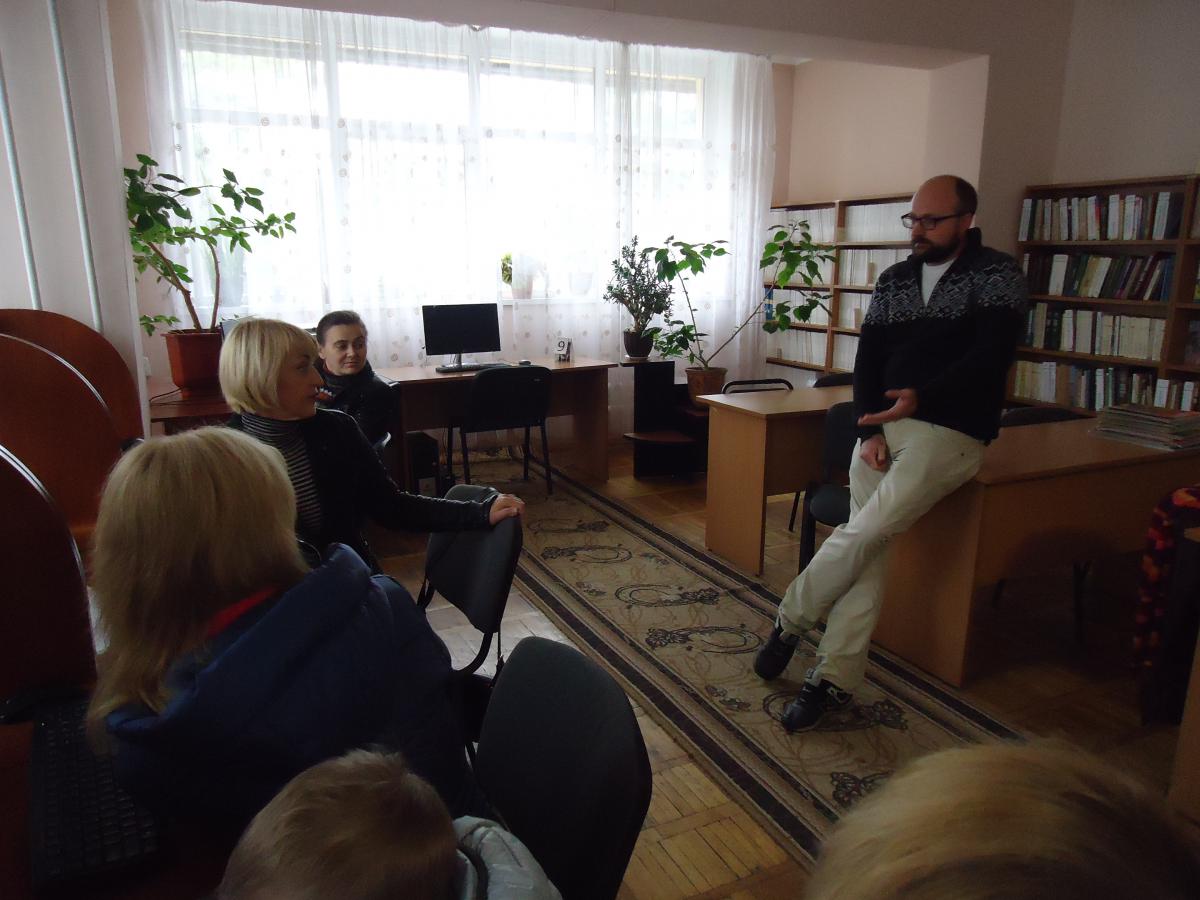 Цього разу під час комп’ютерного заняття до бібліотеки завітав Сергій Дячук, бориспільський історик, постійний читач центральної бібліотеки. Під час перерви пан Сергій звернувся до відвідувачів із запрошенням на столичну виставку «Історія на горищі». У Києві до свята Покрови влаштують виставку, де покажуть серію колажів наукового співробітника Музею книги і друкарства України Сергія Дячука. Між істориком та слухачами комп’ютерного курсу відбулась відверта та болюча розмова про причини ситуації на Сході України сьогодні. Користувачі подякували Сергію за його увагу до них та надану інформацію, зацікавились запропонованою виставкою.