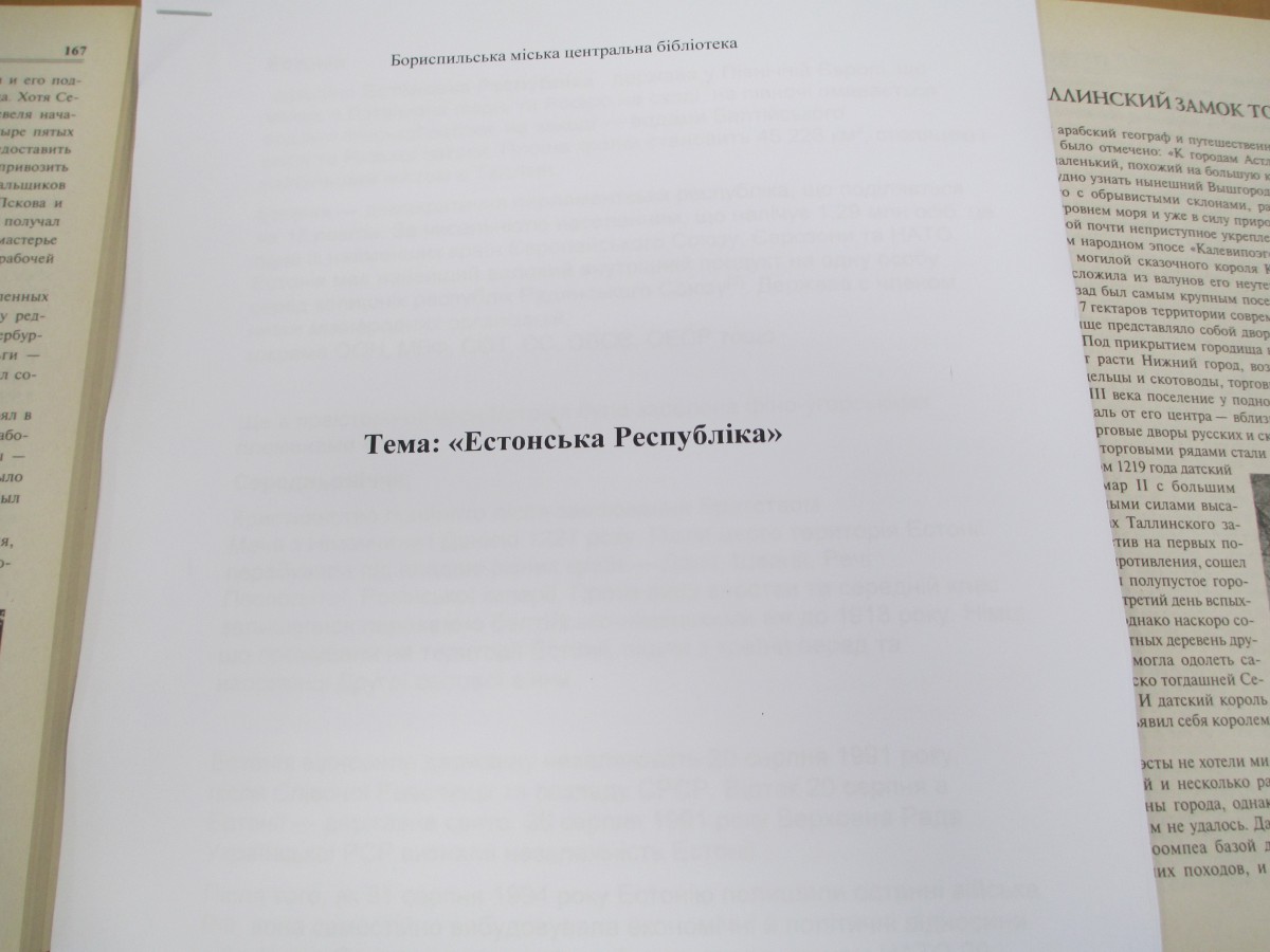 14 серпня 2018 для відвідувачів читальної зали Бориспільської центральної бібліотеки в рамках проекту «Бібліоглобус» бібліотекар Надія Балицька провела чергову оглядову мандрівку країнами Євросоюзу. Цього разу метою «подорожі» стала Естонська Республіка.