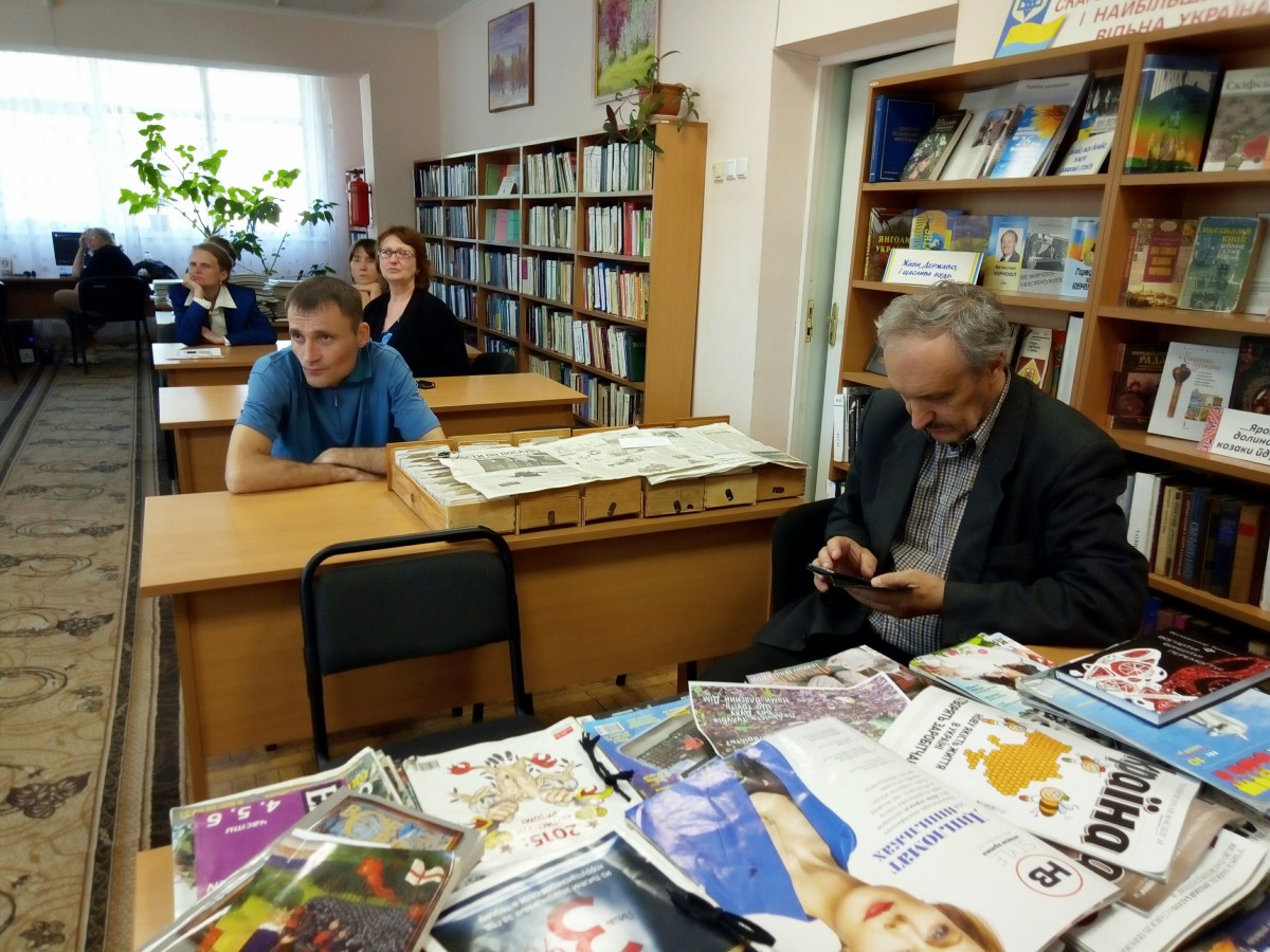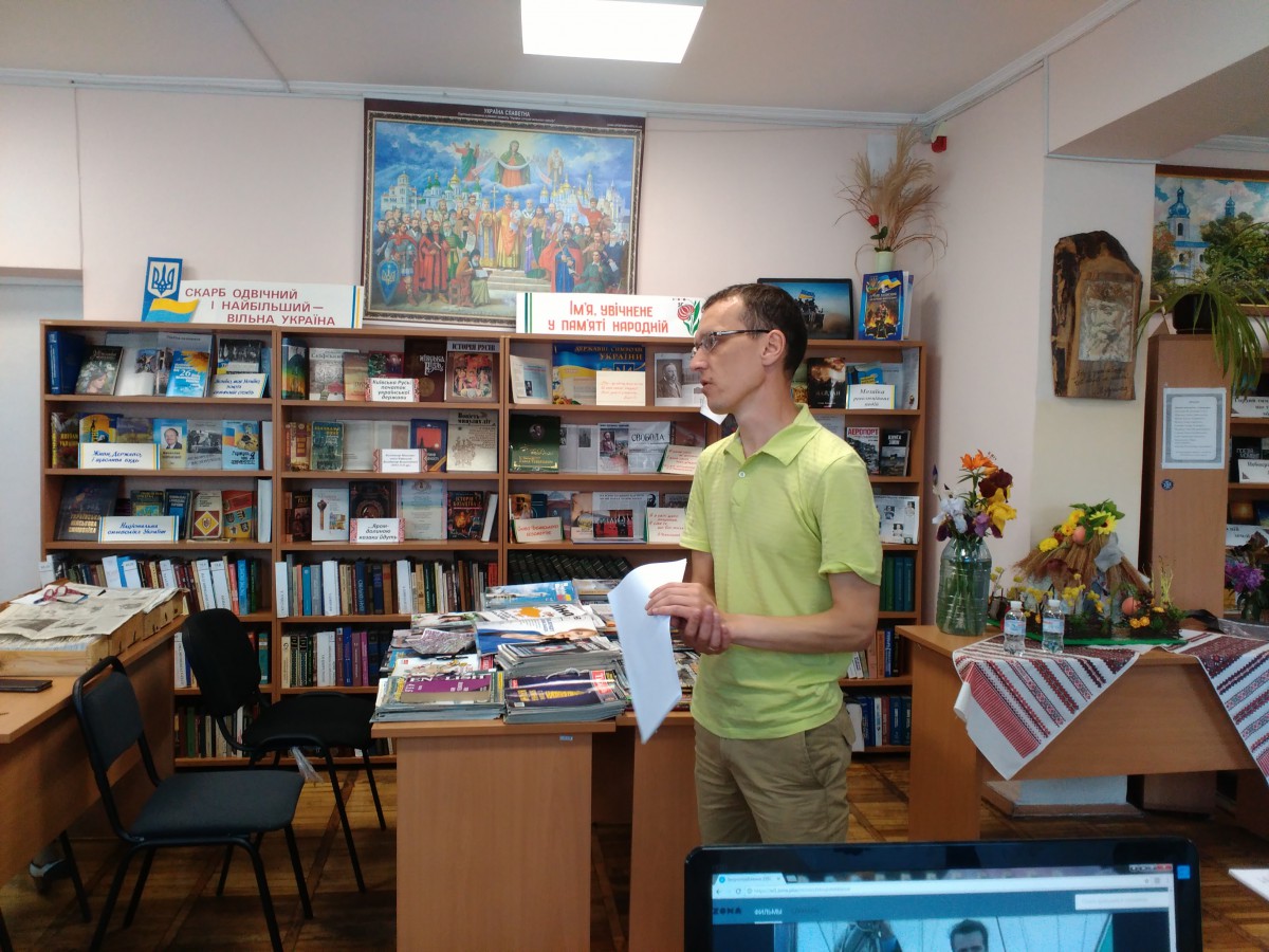 25 травня 2018 відвідувачам центральної бібліотеки пощастило зустрітись з надзвичайно цікавою людиною і співбесідником. Володимир Тимчук – відомий поет, перекладач, підполковник Збройних Сил України, викладач військової топографіі в Національній академії сухопутних військ ім. гетьмана Петра Сагайдачного, кандидат технічних наук, лауреат премії ім. Богдана Хмельницького за краще висвітлення військової тематики у творах літератури та мистецтва (2016), співпереможець конкурсу прози про УПА від видавництва «Discursus» (2014) та ерудована і скромна людина.